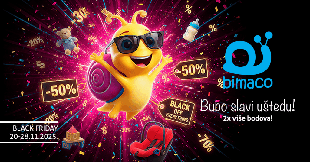 😀 Bimaco Black Friday traje od 20.11. do 28.11. i donosi vam priliku za najveće uštede ove godine! Bubo zna koliko je važno odabrati kvalitetno za vaše mališane, zato smo snizili cijene najtraženijih proizvoda.