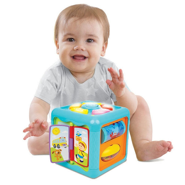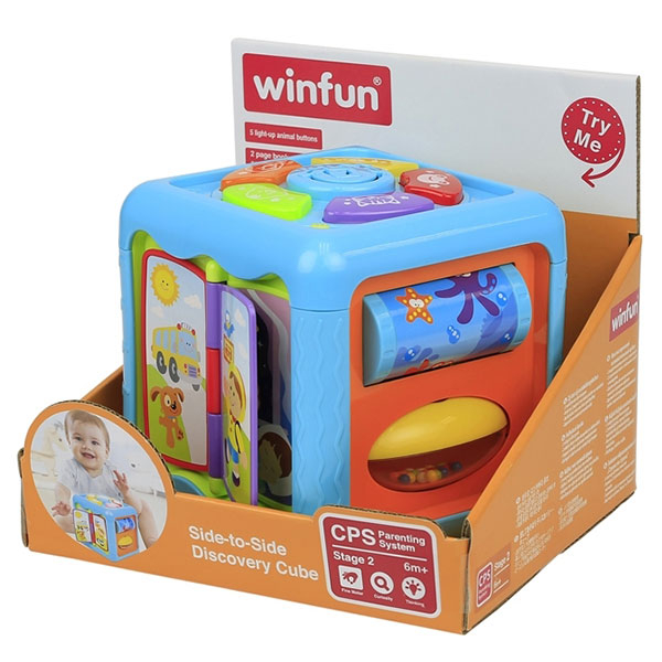 Kocka Winfun 000715 nudi više aktivnosti na svakoj svojoj strani, potičući dijete na istraživanje kroz dodir, pokret i promatranje. Različiti oblici, boje i pomični dijelovi pomažu razvoju osjetila te potiču ranu znatiželju.
