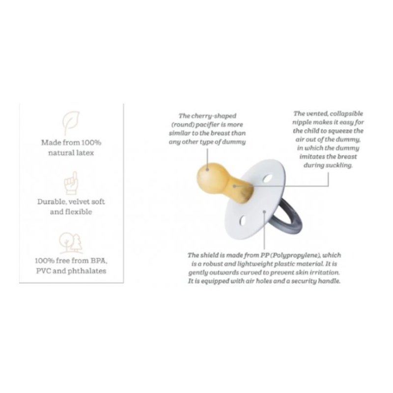 BIBS dude su više od samo dodatka; one su simbol povjerenja i kvaliteta koji traje već skoro pola stoljeća. Okrugli štitnik i bradavica u obliku trešnje, izrađeni od 100% prirodne gume, dizajnirani su tako da pružaju autentičan osjećaj sisanja i maksimalnu udobnost vašem djetetu. Prirodni lateks je svilenkast, mekan i fleksibilan, stvarajući osjećaj bliskosti i sigurnosti. Materijali bez BPA, PVC-a i falata osiguravaju zdravlje i dobrobit vašeg djeteta, dok dizajn proizveden u Danskoj garantira vrhunsku kvalitetu.