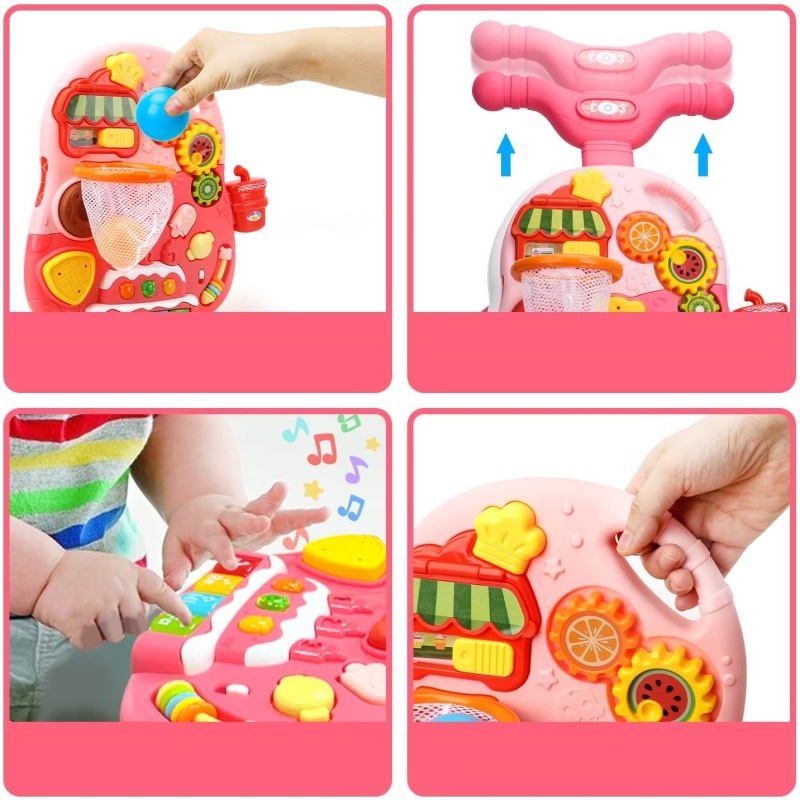Ova guralica ima dodatni košarkaški stalak koji se može postaviti na prednju ili bočnu stranu panela. Beba će uživati u igri, razvijajući koordinaciju oko-ruka i fine motoričke vještine. Slatke glazbene igračke s raznobojnim dizajnom i smiješnim zvucima pomažu bebi da nauči o životinjama i razvije osjećaj za glazbu.