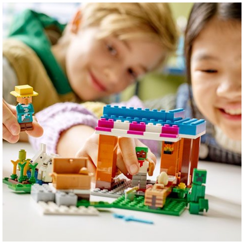 Komplet LEGO® Minecraft Pekarnica (21184) pun je likova, zabavnih dodataka i funkcija iz igre Minecraft® – idealna poklon za djecu od 8 godina i starije. Razni oblici zabave za kreativnu djecu Komplet igračaka iz serije Minecraft daje djeci priliku da se zabave i igraju na razne načine. U njemu su likovi iz igre Minecraft, pekar, snježni seljak, koza i Creeper™. Prometna pekarnica ima uređenu prostoriju u kojoj djeca mogu smišljati priče iz obiteljskog života. No prije nego što ispeku kruh ikolače, djeca moraju prikupiti sastojke. Dobit će pšenicu ako pomognu poljoprivredniku da je uzgoji. Mlijeko će dobiti kada pomuzu kozu. Tek se tada mogu pridružiti pekaru i pokazati kreativnost u kuhinji. Igra je još napetija jer strašni Creeper vreba iz prikrajka, s opakim planom da uništi škrinju u kojoj je vrijedno jaje. Djeca moraju obraniti pekarnicu klasičnim oružjem iz Minecrafta, dijamantnim mačem. Modularni komplet može se jednostavno presložiti poslije bitke za beskrajne nove pustolovine.