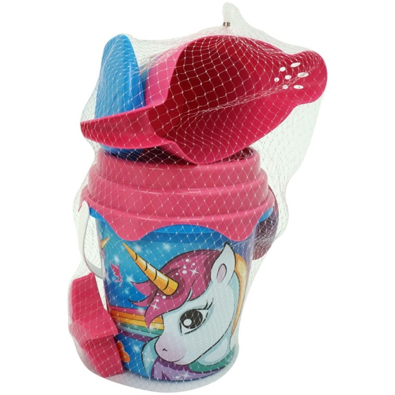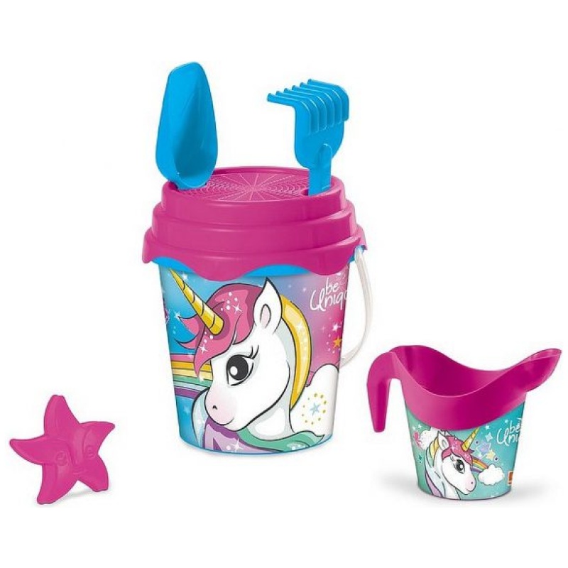 Kvalitetni dječji set za igru s motivom jednoroga sadrži sve što dijete treba za uređivanje vrtne gredice i igru na plaži. Set se sastoji od male kante, posude za zalijevanje, sita, lopatice, grabljica i oblika za otiske.