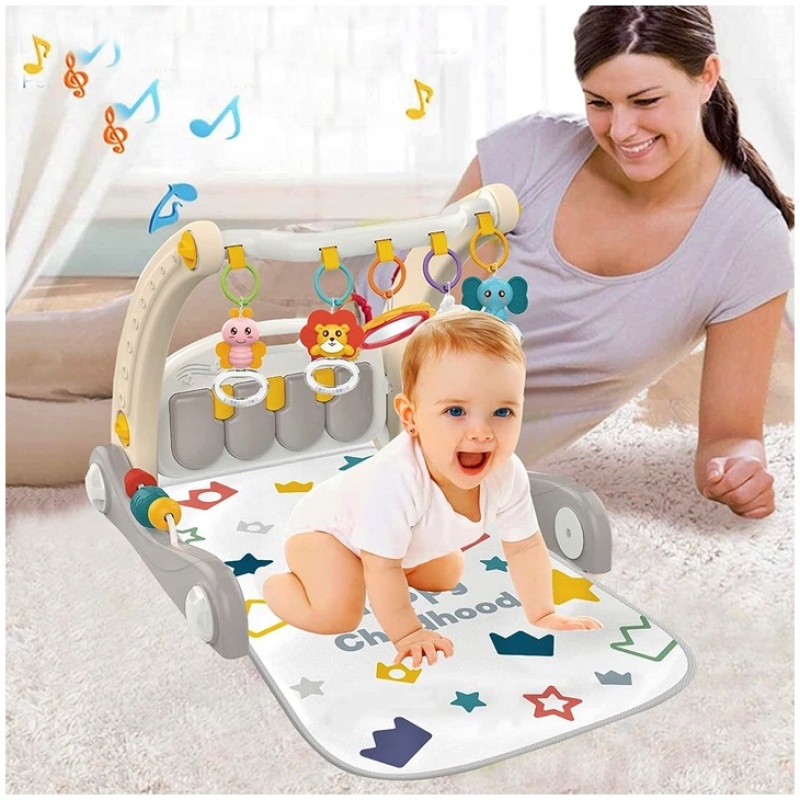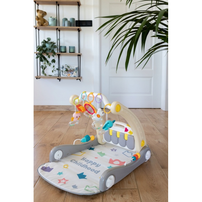 Prva faza igre je na udobnoj i mekanoj podlozi, gdje će dijete moći ležati, sjediti, kotrljati se i igrati uz zvučne i svjetlosne efekte. Zahvaljujući pet šarenih visećih zvečkica i prekrasnom pianu, vaše dijete će biti stimulirano u razvoju svojih motoričkih vještina i koordinacije.