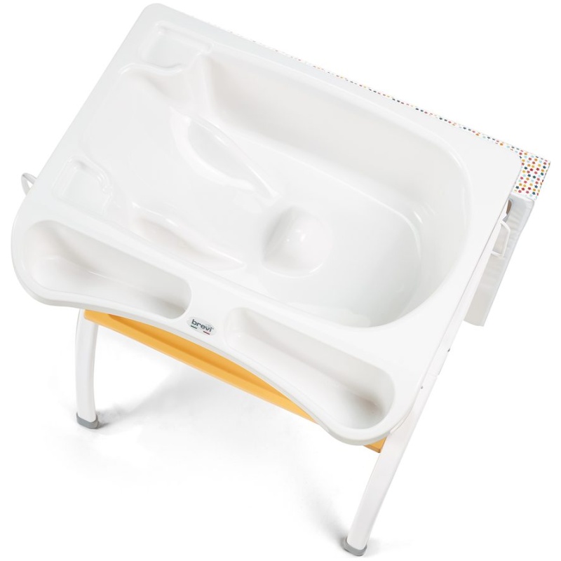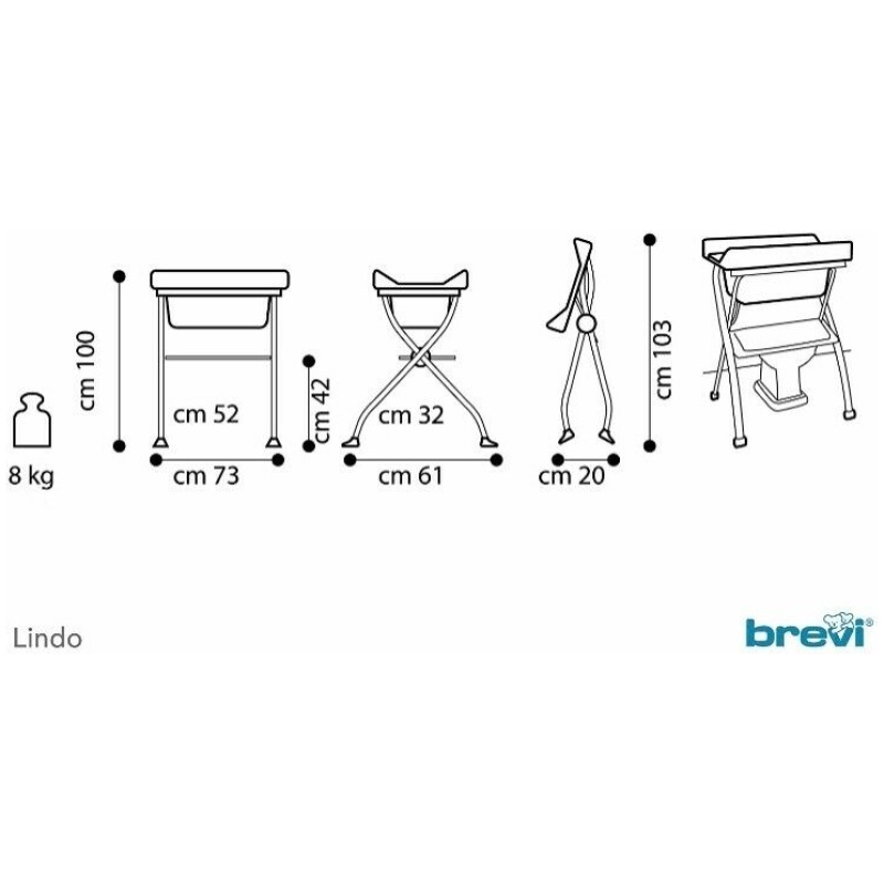 Brevi komoda za kupanje i previjanje Lindo sastoji se od podloge za previjanje, kadice, odstranjive posudice s odvodnom cijevi i praktične plastične police, sve na stabilnoj konstrukciji s protukliznim nogama. Šire stranice podloge za previjanje imaju povišene rubove kako dijete ne bi skliznulo s podloge prilikom previjanja. Stol za previjanje Lindo može se sklopiti, a sklopljen zauzima izuzetno malo prostora.