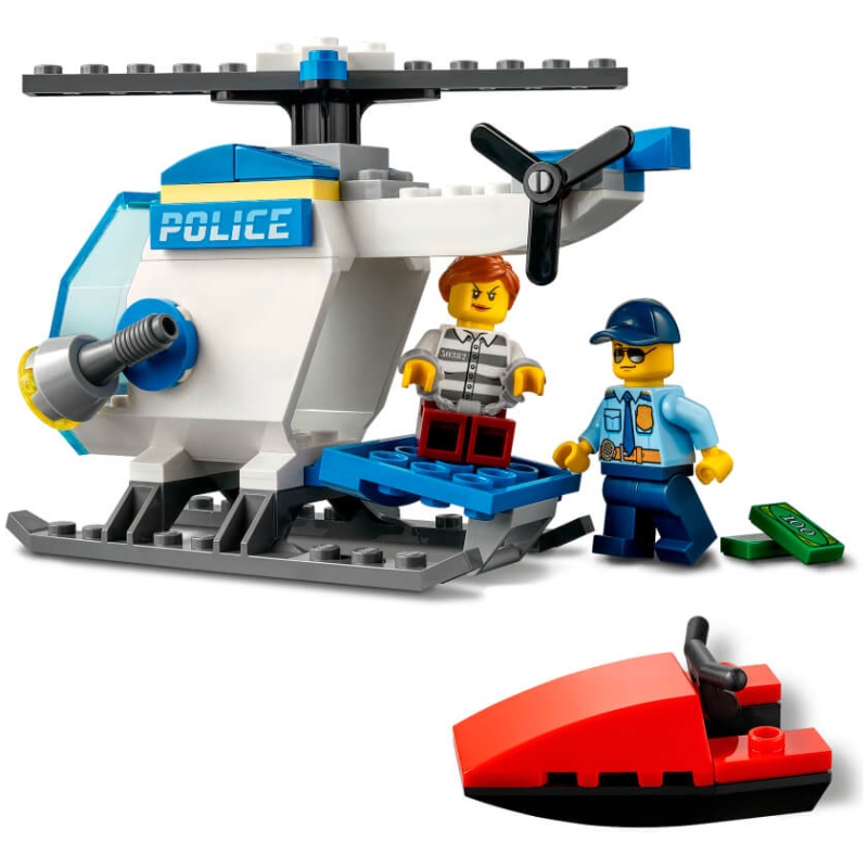 Fiju! Pljačkašica brzo bježi na vodenom skuteru s ukradenim novčanicama u ruci. Pozovi policijski helikpter LEGO® Cityja i kreni u potjeru! Pomozi policajcu da pronađe pljačkašicu u bijegu i sleti kako bi je brzo uhvatio. Kada joj stavi lisice i sigurno ukrca, odvezi je do najbližeg zatvora Cityja. Još jedna pustolovina policije LEGO® Cityja puna akcije!
