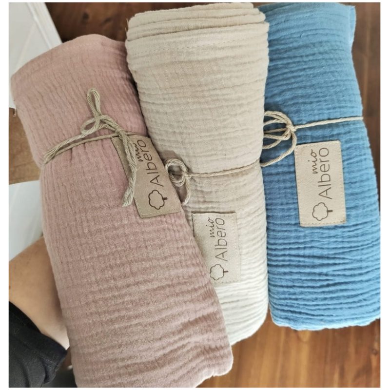 Muslin je prirodna tkanina sigurana za osjetljivu dječju kožu.Prekrivač ima dva tanka sloja muslina.Blago je elastična, ali u isto vrijeme jako dobro zadržava svoju karakterističnu, naboranu strukturu. Važna prednost tkanine je funkcija termoregulacije, koja osigurava odgovarajuću temperaturu tijela bebe. Ljeti hladi, štiti od vrućine, a u prijelaznom razdoblju grije.
