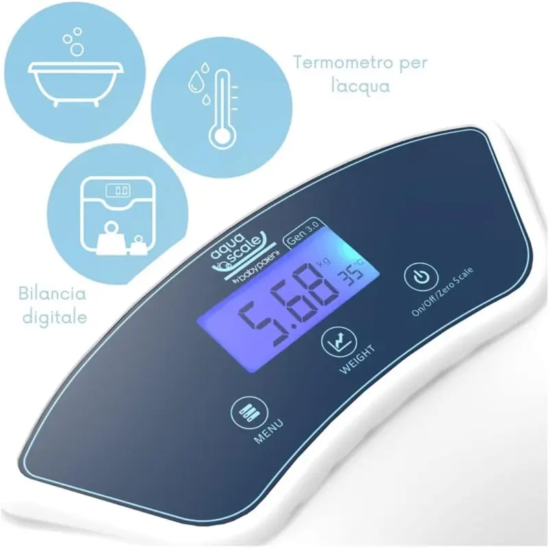 Aqua Scale čuva prethodno očitavanje težine vaše bebe kako biste mogli pratiti dobijanje na težini kod kuće, u poznatom i udobnom okruženju. Aqua Scale ima ugrađeni termometar koji konstantno prati temperaturu vode u kadi i tačno prikazuje rezultate na digitalnom LCD ekranu, u Celzijusovim ili Farenhajtovim stepenima – obezbeđujući da je voda sigurne temperature pre početka kupanja.
