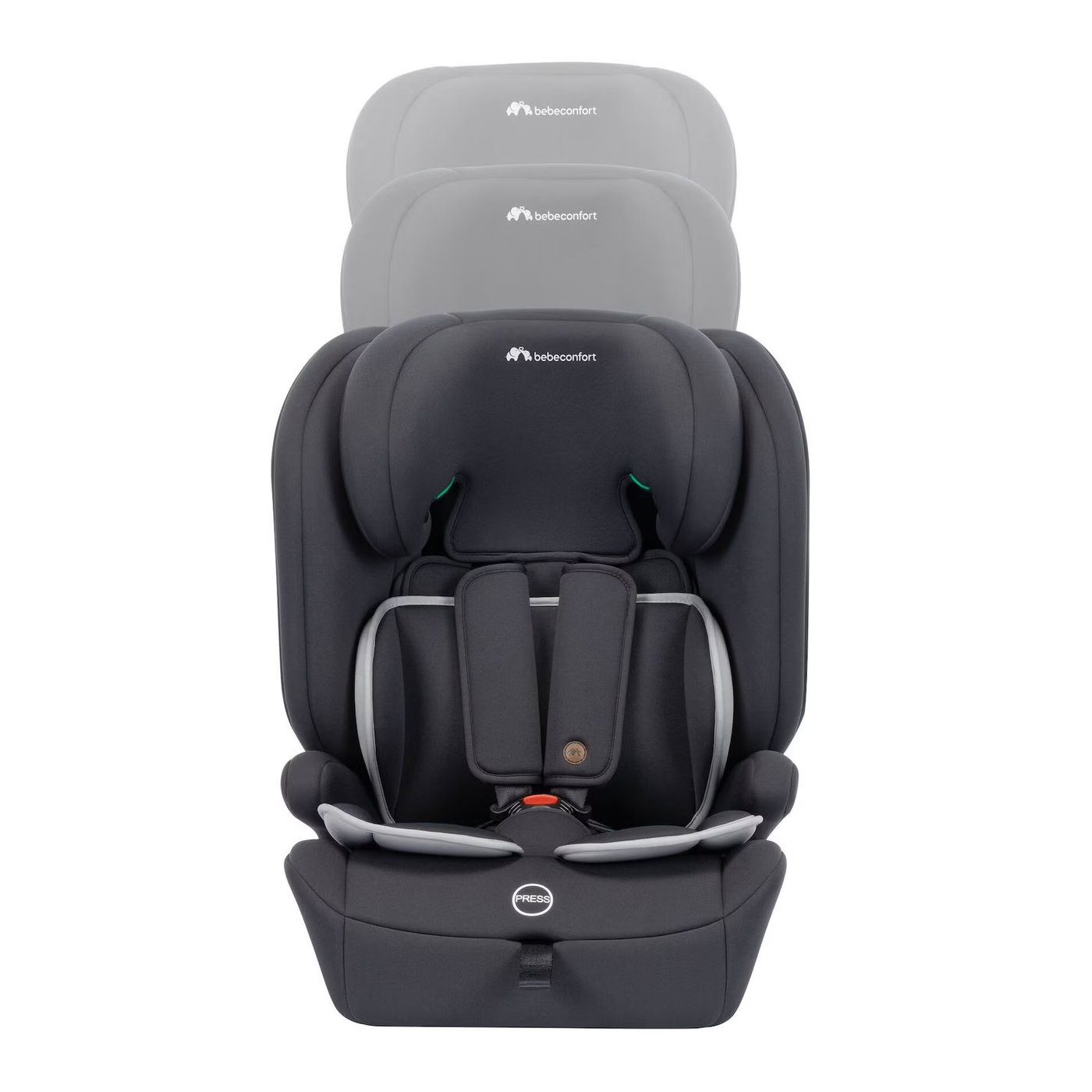 Gray child car seat with five-point harness and extensive body padding, designed for in-car use (bebeconfort branding visible on the headrest).