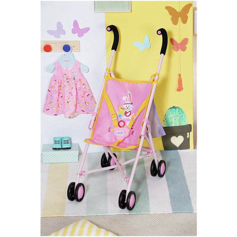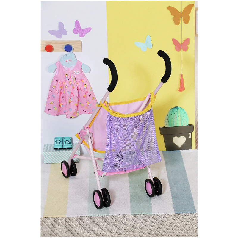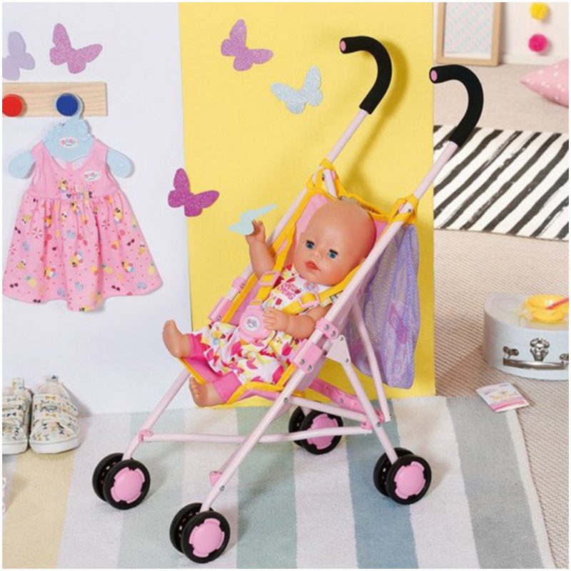 Sa svojim mekim ručkama i čvrstim lako je upravljati proizvodom. Kolica imaju sigurnosni pojas za pričvršćivanje Baby Borna! Također sadrži praktičnu mrežastu torbu za sve osnovne stvari za BABY born i lako se sklapa nakon što BABY born završi svoje avanture.