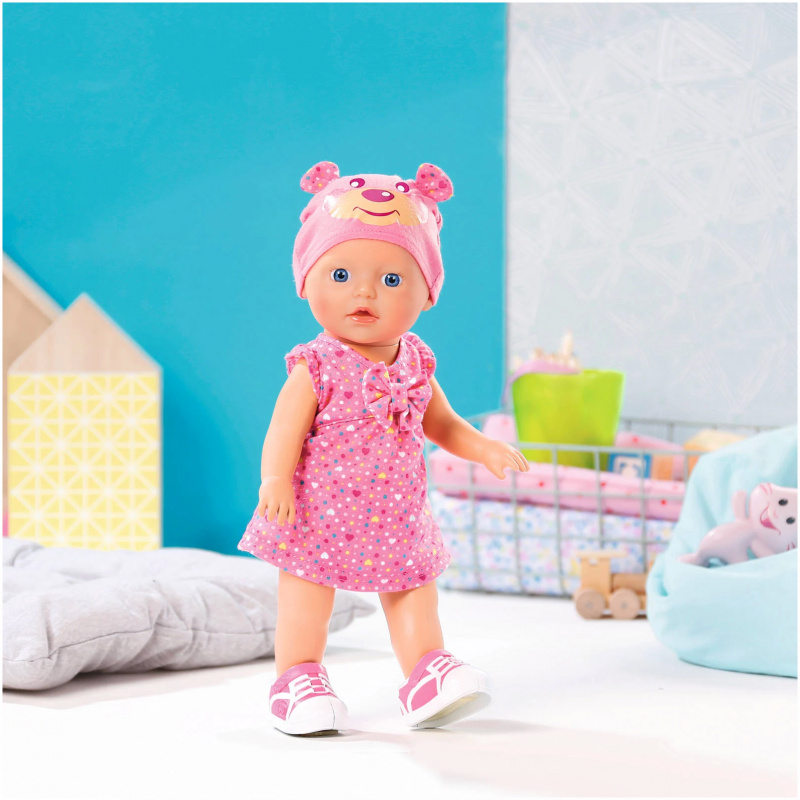 My Little Baby Born Walks čini svoje prve korake i kreće naprijed kada čuje zveckanje zeca ili kada joj se obratite. U svom plišanom šeširu s ušima i razigranoj ružičastoj haljini s mašnom ona hoda po spavaćoj sobi. Naravno, s takvim sportskim cipelama može hodati. Dok hoda, My Little Baby Born veselo maše rukama po zraku, smije se i kaže mama i tata. Funkcijska lutka od 32 cm hoda po glatkom podu. Potrebne baterije: 3 x AAA (nisu uključene) . Za uzrast od 2 godine i više.