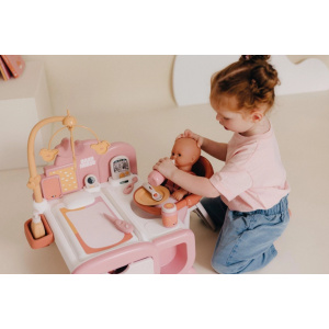 Ovaj kutak je pažljivo osmišljen kako bi potaknuo maštovitu igru i razvio emocionalnu inteligenciju kod djece. S jedinstvenim kombiniranim prostorom za spavanje i presvlačenje, uključuje prilagodljiv okvir za slike, rotirajuću glazbenu kutiju s umirujućim melodijama te elektronički baby monitor. Sve to omogućuje vašem djetetu da razvije osjećaj odgovornosti i brige. Poseban dodatak je i rotirajuća visoka stolica u blagovaonici, savršena za prve obroke lutki. Smoby je osigurao da svaka sitnica bude namijenjena poticanju dječje znatiželje i kreativnosti.