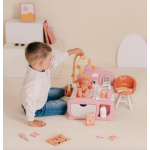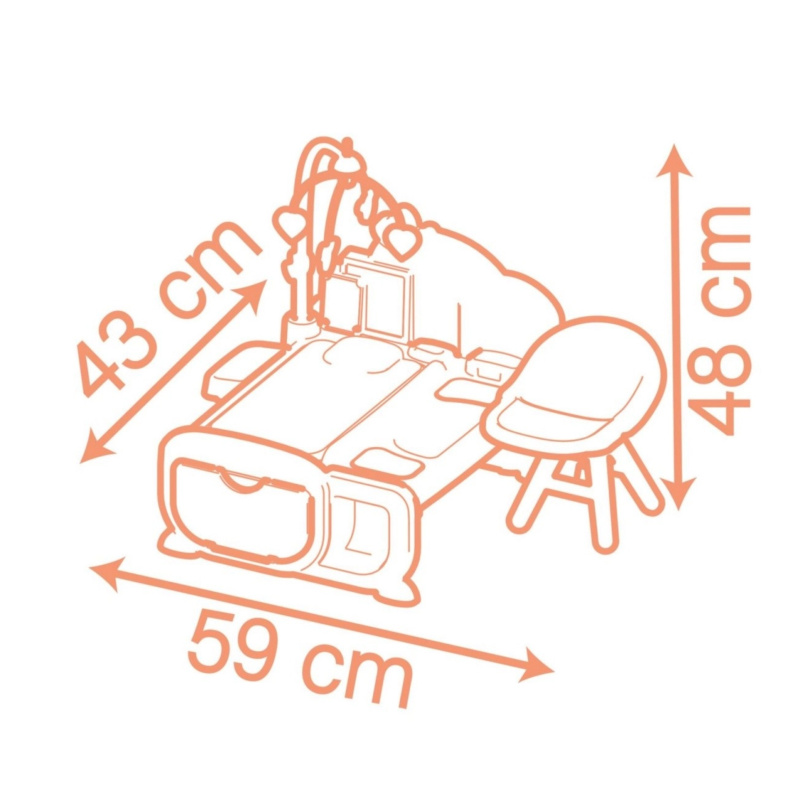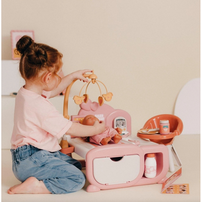 Ovaj kutak je pažljivo osmišljen kako bi potaknuo maštovitu igru i razvio emocionalnu inteligenciju kod djece. S jedinstvenim kombiniranim prostorom za spavanje i presvlačenje, uključuje prilagodljiv okvir za slike, rotirajuću glazbenu kutiju s umirujućim melodijama te elektronički baby monitor. Sve to omogućuje vašem djetetu da razvije osjećaj odgovornosti i brige. Poseban dodatak je i rotirajuća visoka stolica u blagovaonici, savršena za prve obroke lutki. Smoby je osigurao da svaka sitnica bude namijenjena poticanju dječje znatiželje i kreativnosti.