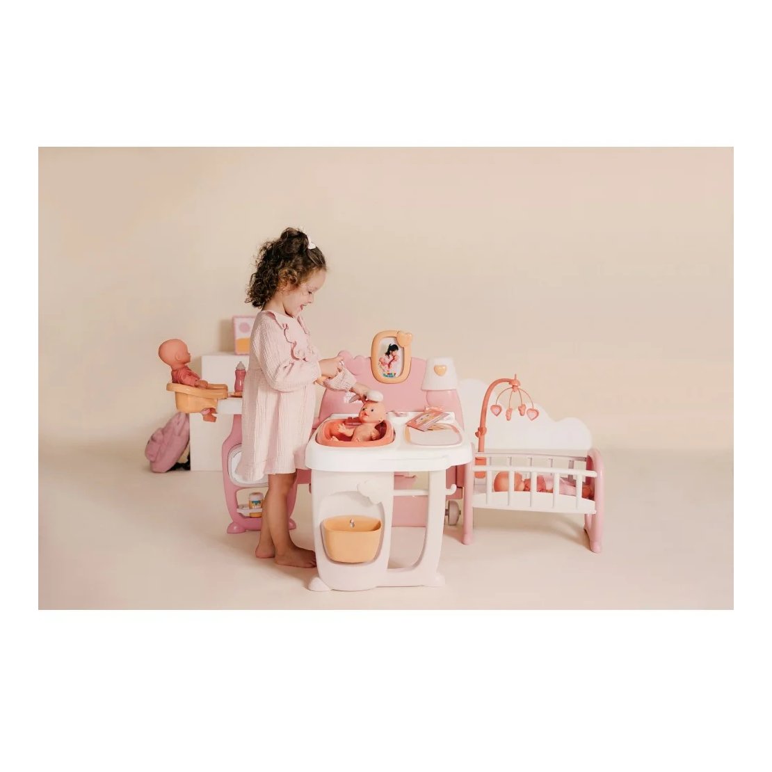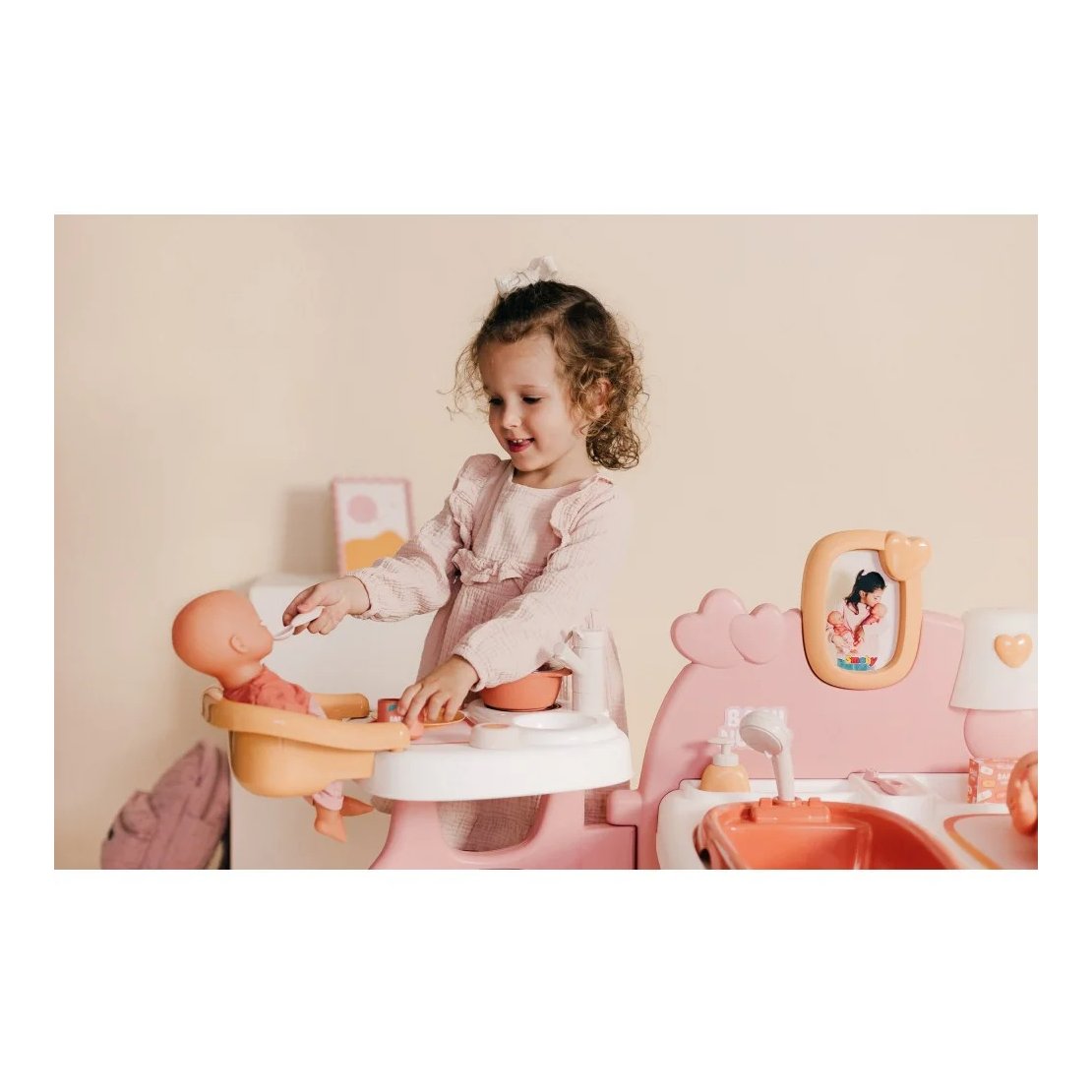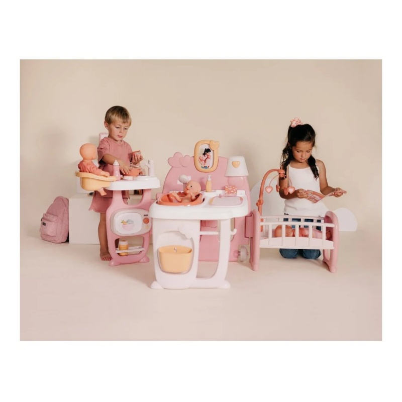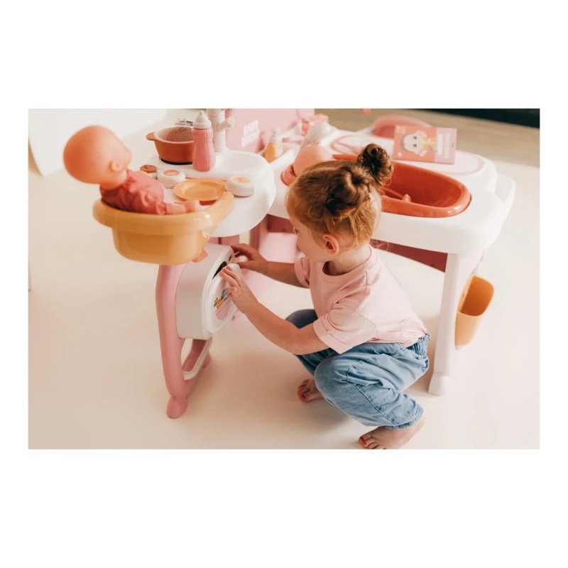 Zahvaljujući 19 dodataka, uključujući hranilicu, mikrovalnu pećnicu, sudoper, i još mnogo toga, vaš mališan može uživati u beskrajnoj zabavi i učenju. Uklonjiva kada i tuš podržavaju igru s vodom, dok stol za presvlačenje i kolijevka s vrtuljkom omogućuju brigu za lutku u svim aspektima. Okvir za fotografije dodaje osobni dodir, a sjenilo koje svijetli u mraku stvara čarobnu atmosferu prije spavanja.