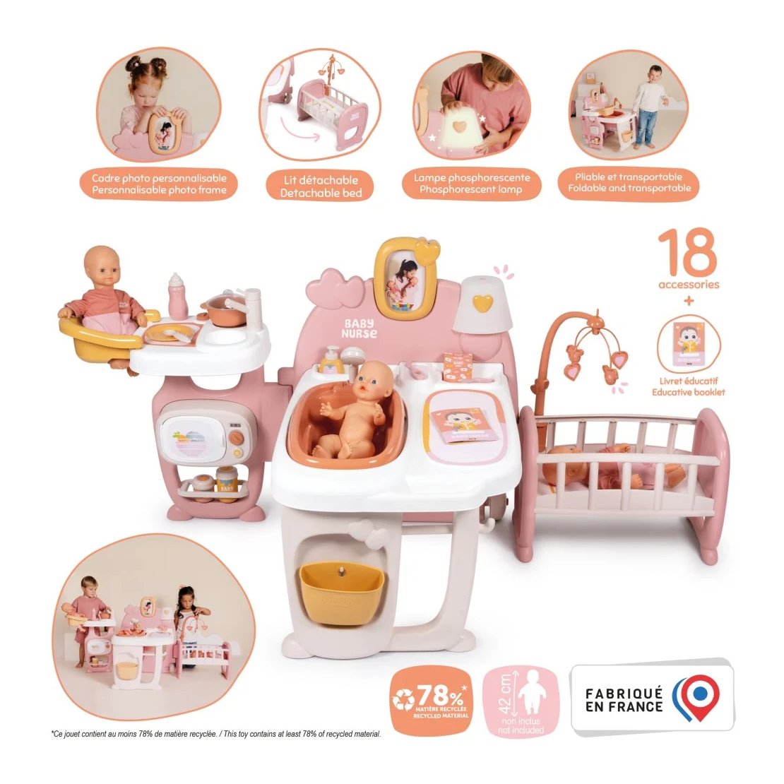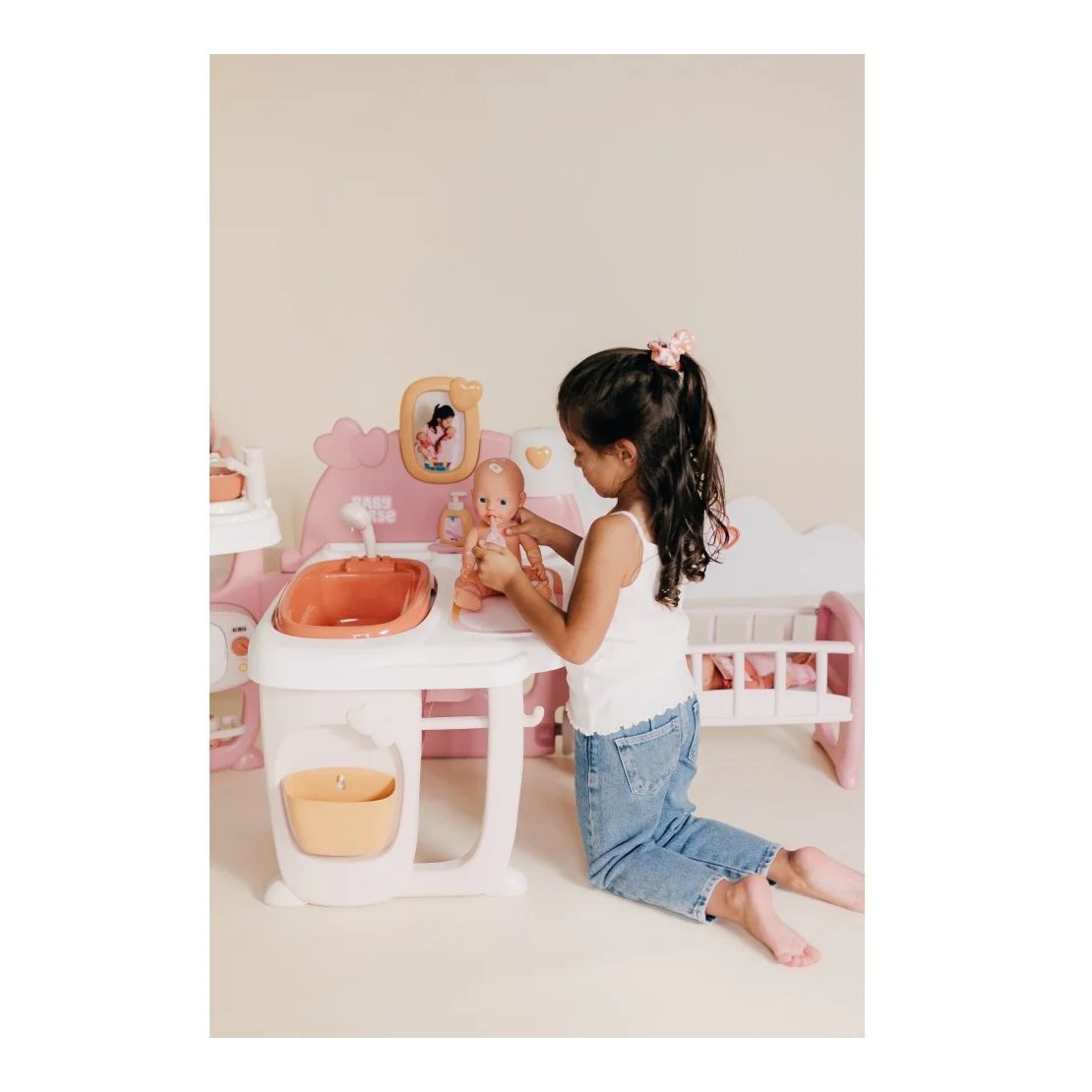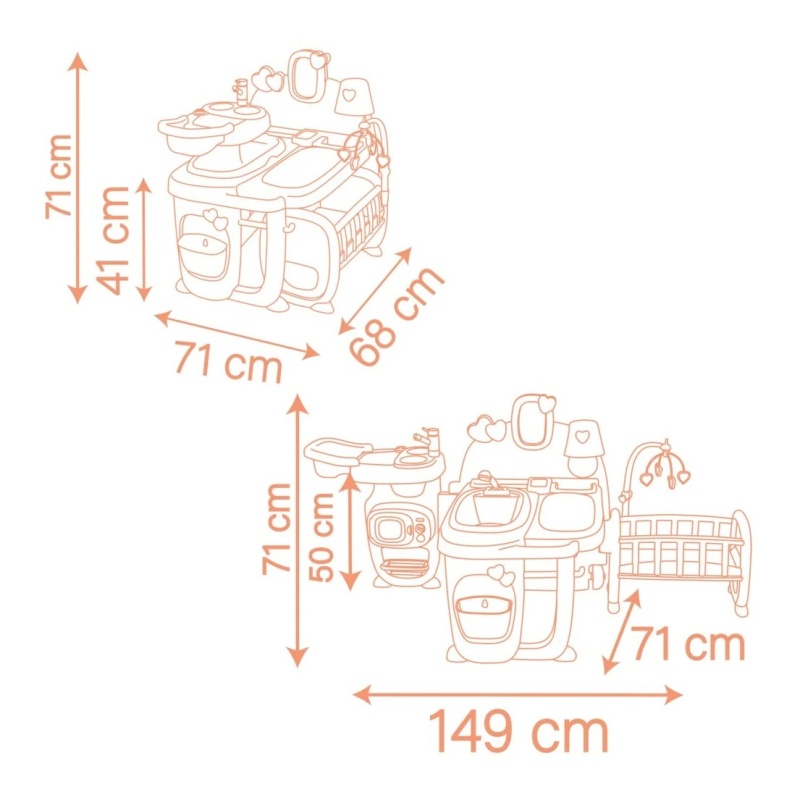 Zahvaljujući 19 dodataka, uključujući hranilicu, mikrovalnu pećnicu, sudoper, i još mnogo toga, vaš mališan može uživati u beskrajnoj zabavi i učenju. Uklonjiva kada i tuš podržavaju igru s vodom, dok stol za presvlačenje i kolijevka s vrtuljkom omogućuju brigu za lutku u svim aspektima. Okvir za fotografije dodaje osobni dodir, a sjenilo koje svijetli u mraku stvara čarobnu atmosferu prije spavanja.