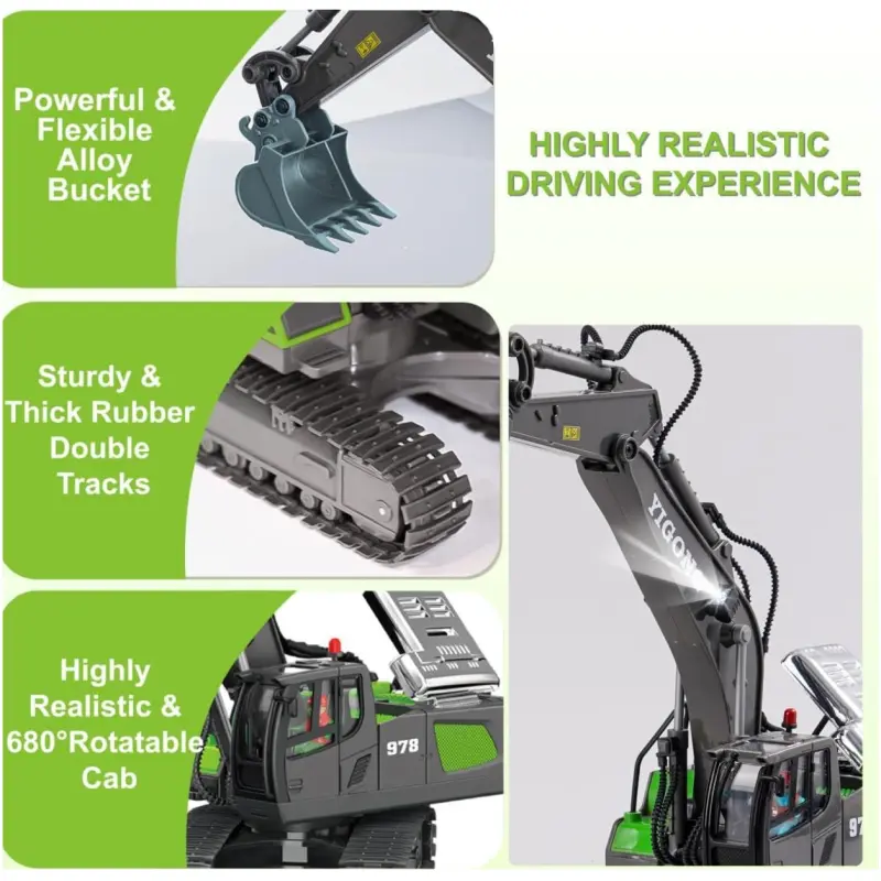 Opremljen izvanrednim 11-kanalnim 2,4 GHz bežičnim daljinskim upravljačem, naš bager nudi neusporedivu kontrolu i manevriranje. Vaše dijete može bez napora voditi bager u bilo kojem smjeru, od kretanja naprijed do skretanja lijevo, pa čak i kopanja, rotiranja i istovara s lakoćom. Mogućnosti su beskrajne, potičući vašeg malog istraživača da istraži i oslobodi svoju maštu u potpunosti.