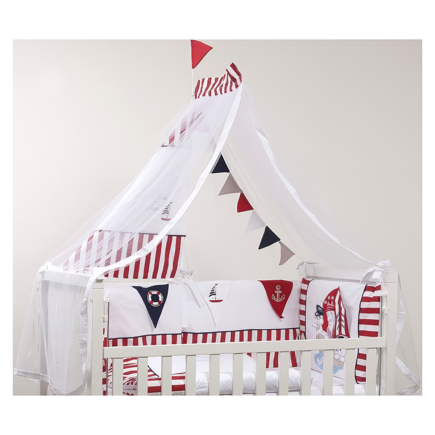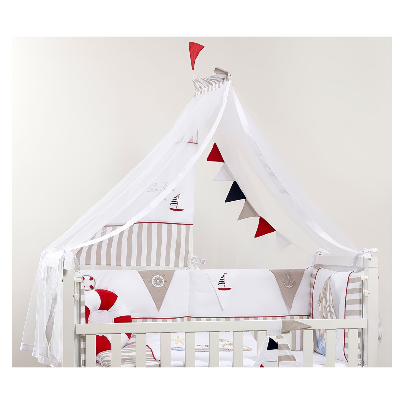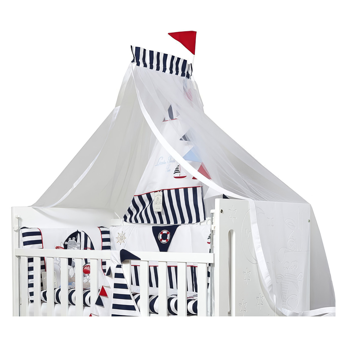 Ovaj predivan baldahin donosi nježnu sigurnost i čarobnu atmosferu u svaki dječji kutak. Lako se postavlja na krevetac ili kolevku, stvarajući mirno i udobno okruženje za bebu. Uz to, svojim razigranim morskim motivima unosi toplinu i veselje u prostor, te ga istovremeno štiti od prašine i pretjerane svjetlosti.