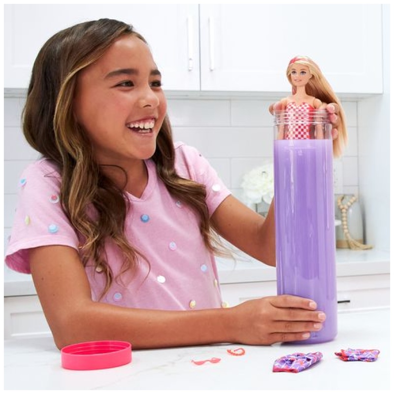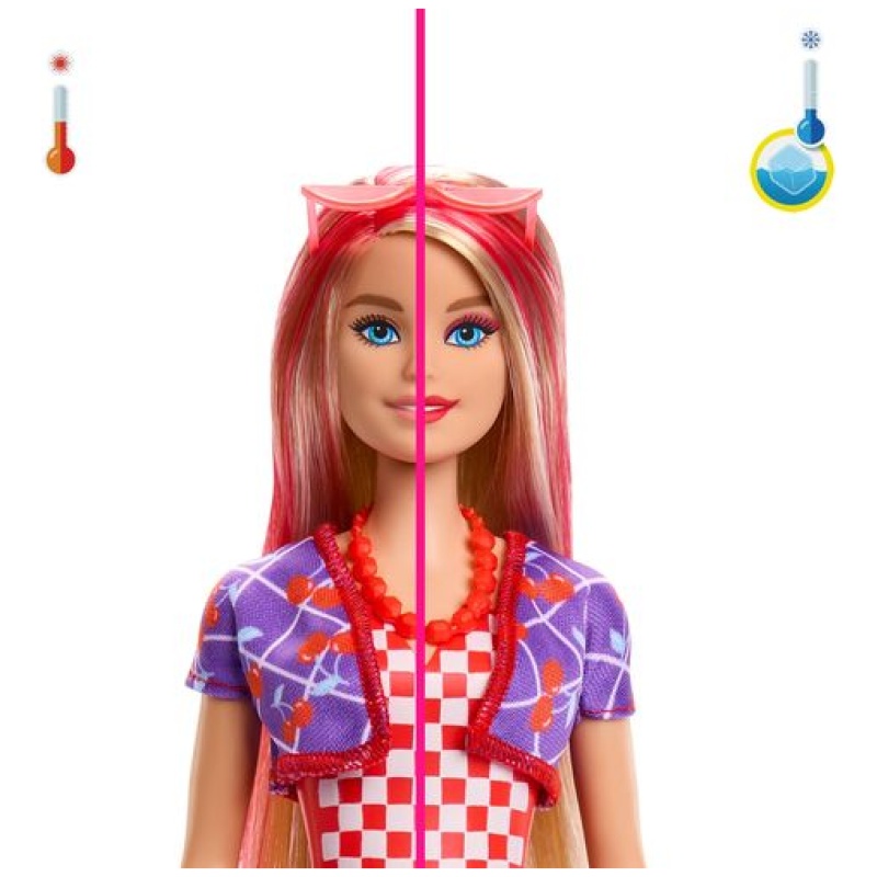 Svaka Barbie® Color Reveal™ lutka dolazi u premazu s printom mješovitog voća – trešnje, lubenice, jagode, ananasa ili citrusnog limuna. No, to nije sve! Kada staviš lutku u toplu vodu i vrtiš je, događa se čarolija – voda postaje ljubičasta, a lutka otkriva WOW izgled! Promjene boje na očima i usnama mogu se mijenjati koristeći ledeno hladnu i toplu vodu, tako da se svaki put možeš igrati i stvarati nove izglede.