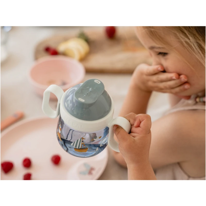 Simpatična Little Dutch bočica iz kolekcije Sailors Bay s dvije ručkice pomoći će vašem mališanu da nauči samostalno piti. Bočica koja ne prolijeva je savršena za malene ruke koje tek uče piti. Bez obzira na to drži li je beba naopako, neće se proliti.