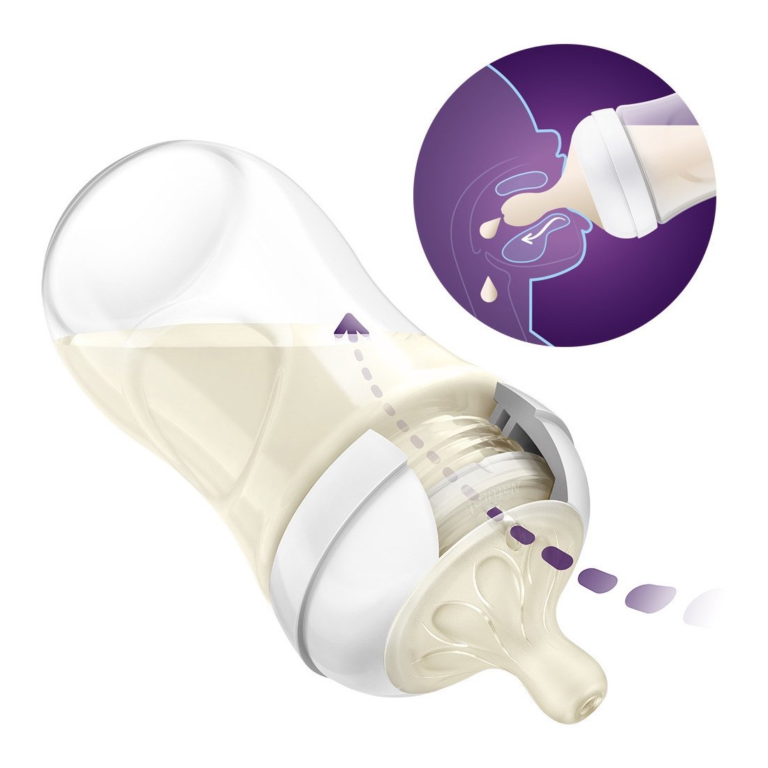 Naša bočica dizajnirana je s jedinstvenim sisačem Natural Response, koji omogućuje mlijeku da teče samo kad vaša beba aktivno pije, imitirajući prirodni ritam dojenja. To znači da vaša beba može bez problema kombinirati dojenje i hranjenje na bočicu, jer će se osjećati kao da je na dojci. Osim toga, široki, mekani sisač oponaša oblik dojke, pružajući bebama osjećaj sigurnosti i udobnosti dok se hrane.