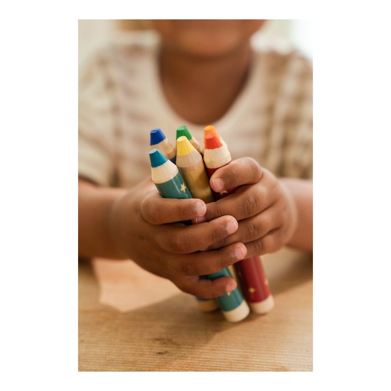 To su meki, pastelni tonovi koji potiču nježnu, ali živopisnu interpretaciju dječjih ideja. Svaka bojica je dizajnirana sa specifičnom pažnjom prema detaljima – kratke i debele, baš onakve kakve male dječje ruke trebaju za savršeno držanje i kontrolu. Njihova ergonomičnost omogućuje djeci da se usredotoče na ono najvažnije – stvaranje vlastitih remek-djela.