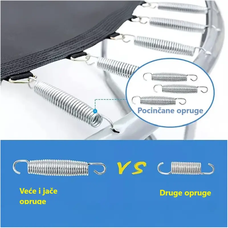 GALVANIZIRANI OKVIR I OPRUGE: Kvaliteta na koju se možete osloniti! Galvanizirani čelik otporan na hrđu osigurava da će trampolin izdržati sve dječje igre, vremenske uvjete i godine korištenja, postajući vjerni suputnik u odrastanju vaše djece.