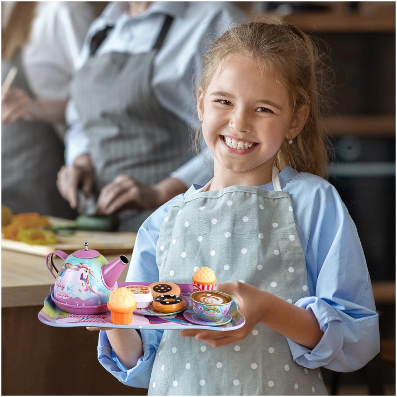 Set je opremljen i prekrasnim pladnjem na kojem se mogu poslužiti pripremljeni napici i grickalice. Pladanj dodaje eleganciju i autentičnost igri, dok istovremeno pomaže djeci u organizaciji njihovih čajnih zabava.