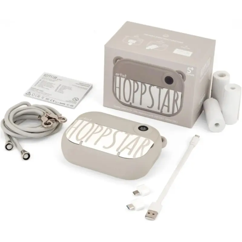 U pakiranju Hoppstar Artist kamere dobit ćete: sam fotoaparat, memorijsku karticu od 16 GB, traku za nošenje, USB kabel za punjenje, 1x OTG adapter Micro USB, 1x OTG adapter Tip C, 3 dodatne rolice papira i korisnički priručnik.