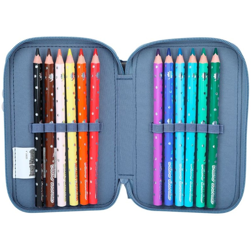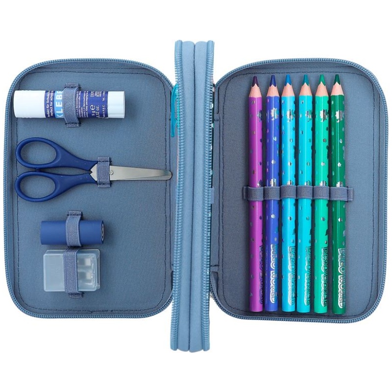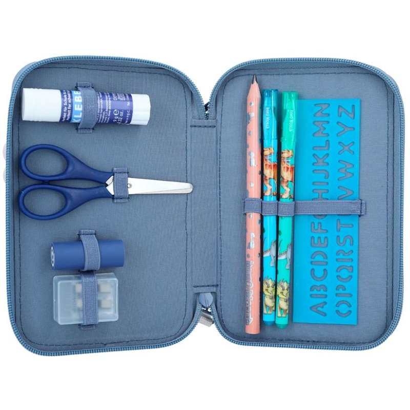 No, Dino World pernica nije samo privlačna izvana. Ispod privjeska, ova pernica ima dva odvojena kata koji su potpuno ispunjeni raznobojnim i kvalitetnim školskim priborom. Tu su 12 debelih olovaka u boji za kreativno crtanje i bojanje, 2 svjetlucave gel olovke koje će dodati poseban sjaj svakom crtežu, debela olovka za pisanje i crtane skice, duplo šiljilo za olovke koje omogućuje precizno oštrenje, gumica za brisanje grešaka, ravnalo sa šablonama za precizno crtanje, škare za kreativne projekte i štapić ljepila za sigurno zalijepiti sve kreativne uratke.
