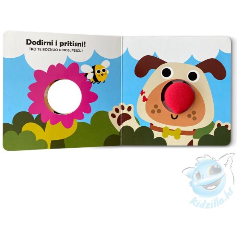 “Dodirni i pritisni – Smiješni nos” je interaktivna slikovnica namijenjena najmlađim čitateljima. Svojom crvenom trubicom prekrivenom tkaninom, ova slikovnica je neodoljiva za dodirivanje i pritiskanje. Sa svakom okrenutom stranicom, trubica zasvira i pruža zabavu kako djeci, tako i njihovim roditeljima.