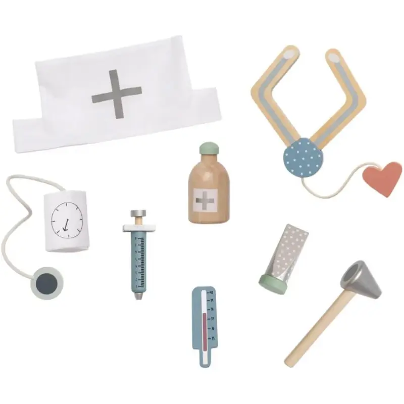 Sastoji se od 9 dijelova koji će omogućiti vašem djetetu da se igra doktora na najrealističniji način. U setu su krema, termometar, šprica, stetoskop, alat za pregled uha i oka, mjerač tlaka, tablet, lijekovi i zavoji. Svi ovi alati pomažu u razvoju djetetove logike i motoričkih vještina.