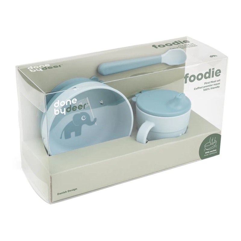 Done By Deer Foodie prvi set za jelo je savršen za male istraživače koji započinju svoje putovanje u svijet samostalnog hranjenja. Ovaj komplet pruža sve što je potrebno za ugodno i sigurno iskustvo obroka za vašeg mališana. S motivom simpatičnog slonića, svaki obrok postaje avantura i radost, a pritom podržava razvoj motoričkih sposobnosti i samopouzdanja kod djece.