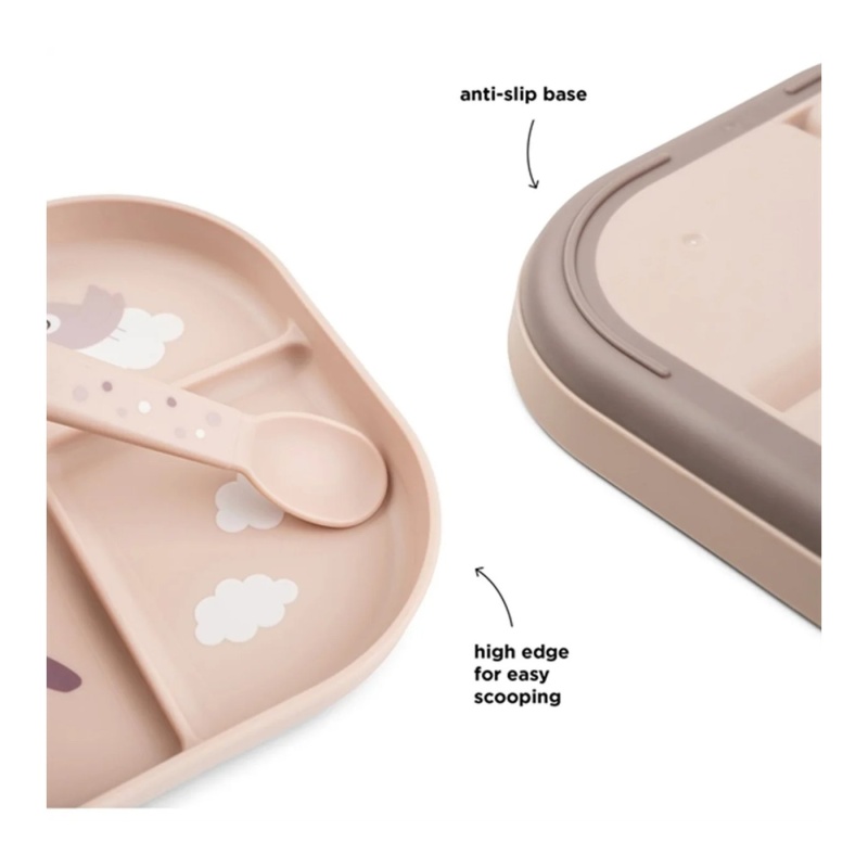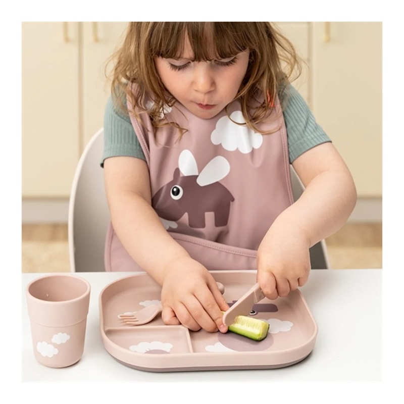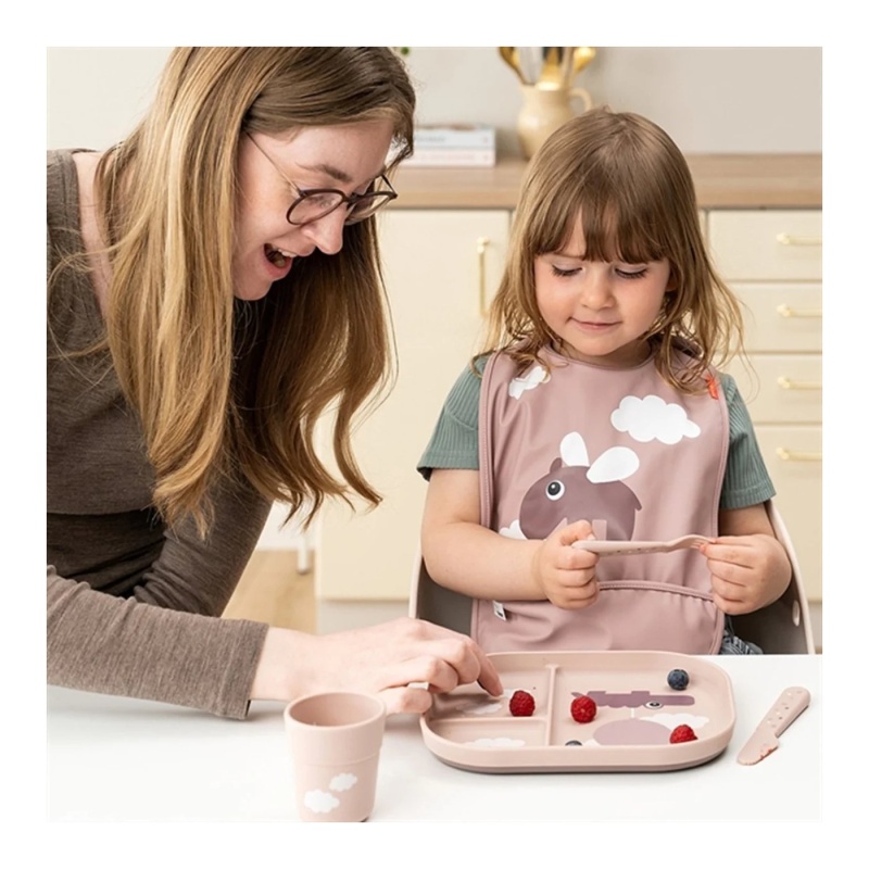 Tanjur je dizajniran s posebnim motivom Happy Clouds, gdje Croco i Birdee lete među oblacima, čineći svaki obrok ne samo hranjivim nego i zabavnim. Djeca su prirodno znatiželjna i ovaj motiv ih poziva da kroz igru i maštanje otkriju nove svjetove okusa. Visoki rubovi omogućavaju lako skupljanje hrane, čime se smanjuje nered i olakšava samostalno hranjenje.