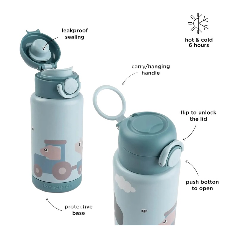 Predstavljamo vam Done By Deer termo bocu, savršeno rješenje za sve roditelje koji žele osigurati da njihove mališane prati osvježavajući napitak tijekom cijelog dana. Ova termos boca izrađena je od visokokvalitetnog nehrđajućeg čelika i polipropilena, što je čini izdržljivom i dugotrajnom.