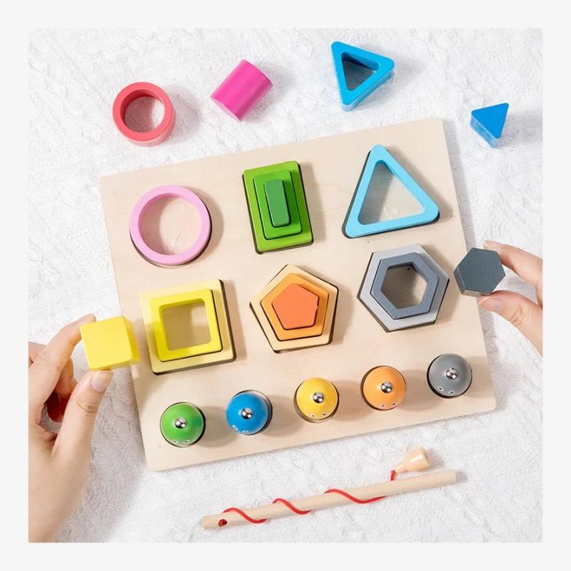 Ova Montessori igračka je više od obične igre sortiranja. Potiče djecu da koriste svoju maštu i eksperimentiraju s gradnjom i balansiranjem. Takve aktivnosti su izvrsne za razvoj fine motorike i koordinaciju oka i ruke. Različite boje i oblici pomažu djeci da nauče razlikovati i kategorizirati, potičući rano razumijevanje geometrije i prepoznavanje boja.