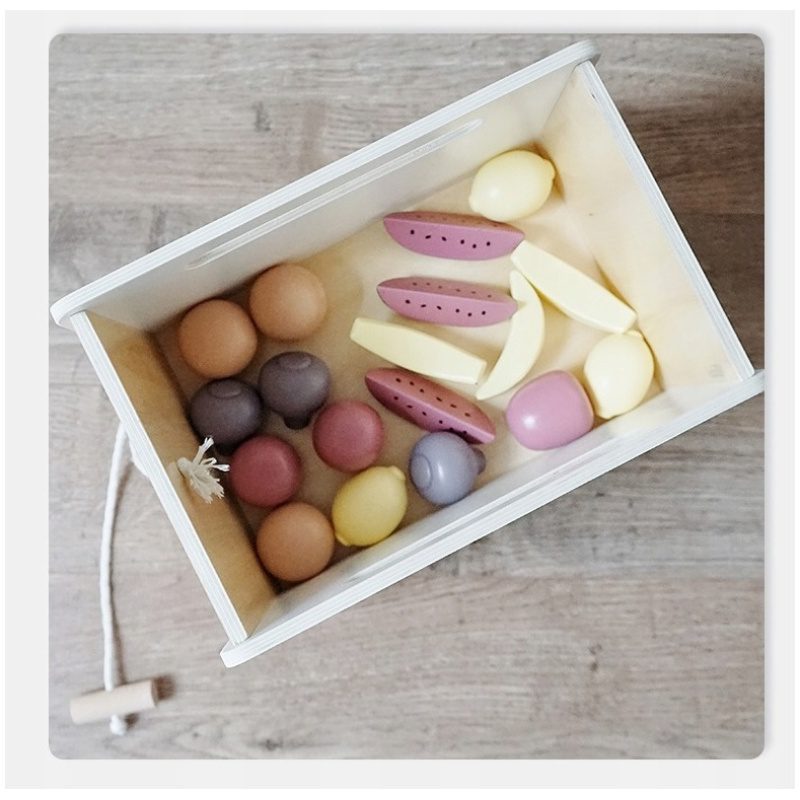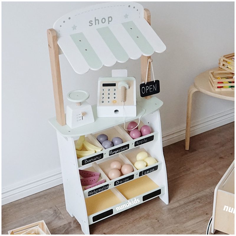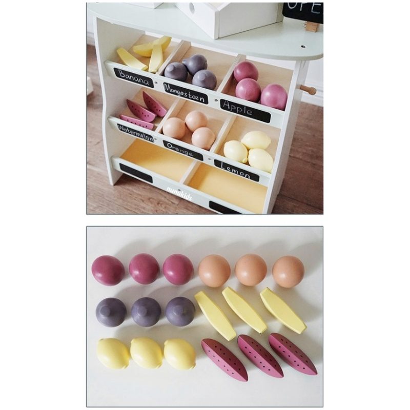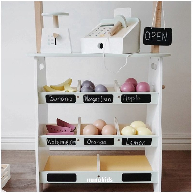 Ovaj drveni market jednostavno ima sve! Pored stalka za voće u set su uključena i kolica za vuču, kasa sa skenerom, vaga i drveno voće!