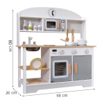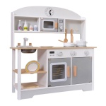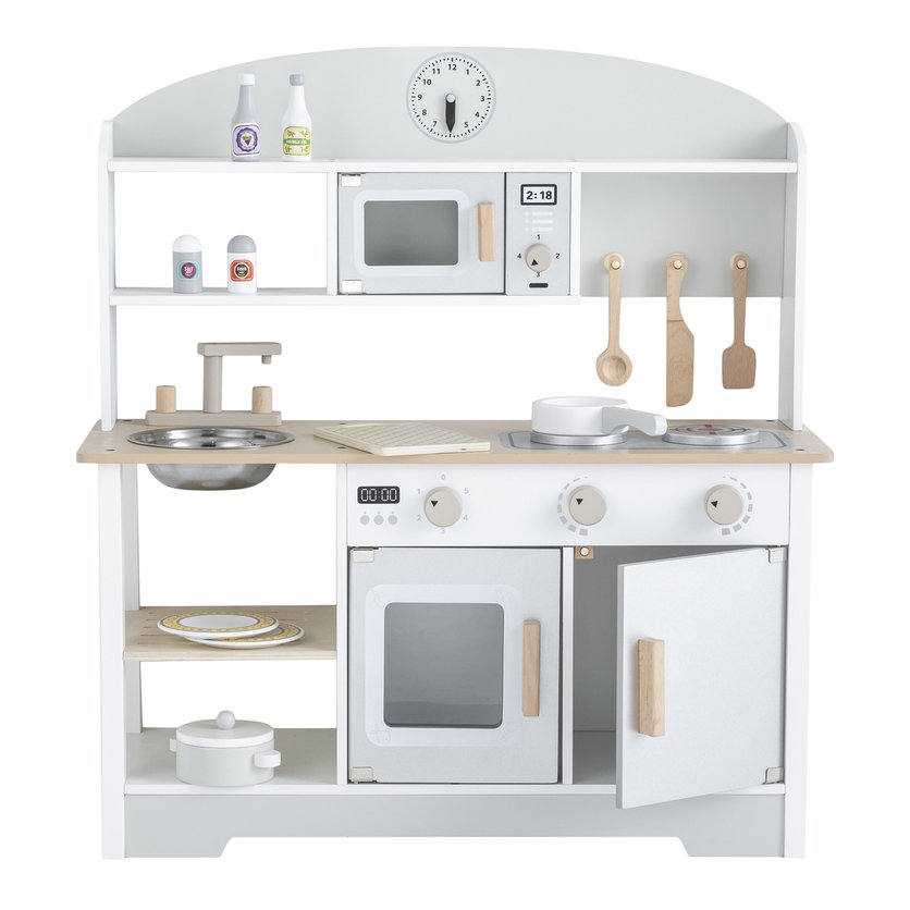 Ono što Drvenu kuhinju izdvaja od drugih jest njezin jedinstveni dizajn koji prati moderne trendove, čime se savršeno uklapa u svaki dom. Izrađena većinom od drva, ova kuhinja je ekološki prihvatljiva opcija za roditelje koji brinu o okolišu. Ova karakteristika ne samo da čini kuhinju održivom nego i izdržljivom, osiguravajući dugotrajnu igru za vaše dijete. Uz dodatke kao što su realistično dizajnirani plamenici i funkcionalni sudoper, mališani će imati priliku naučiti kako funkcioniraju pravi kuhinjski uređaji, a sve to bez rizika od ozljeda.