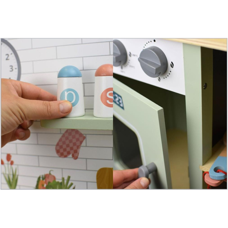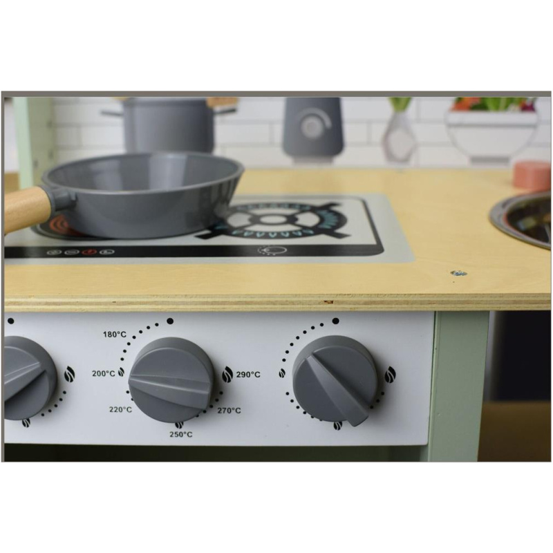 Ovaj sveobuhvatni set sadrži pećnicu, kuhalo i umivaonik, omogućujući djeci da se upuste u maštovite kulinarske avanture. Set dolazi s drvenim i plastičnim kuhinjskim priborom, loncem i tavičicom, pružajući mladim kuharima sve što im je potrebno za pripremu ukusnih obroka.