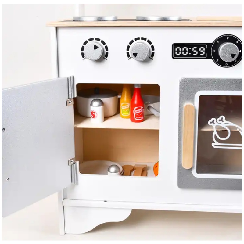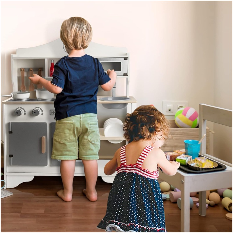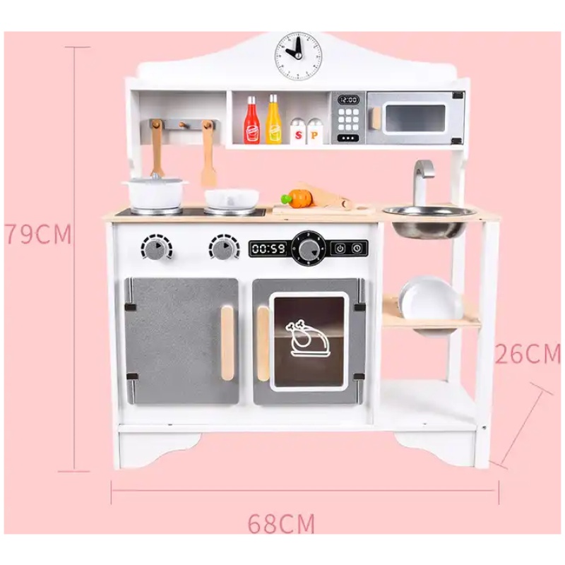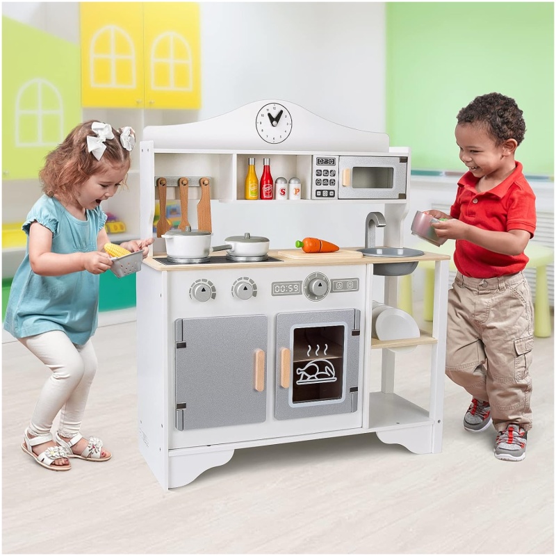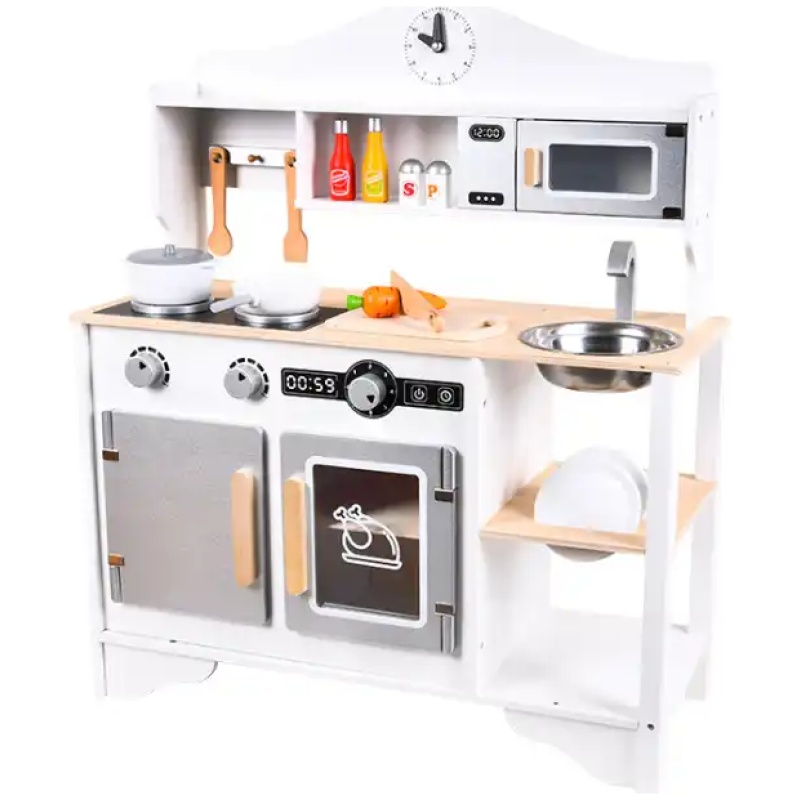 Ova višenamjenska dječja kuhinja ima sve što je potrebno za simulaciju pravih kuhinjskih scena. Uključuje štednjak, mikrovalnu pećnicu, električnu pećnicu, sudoper, kuhinjski ormarić, razne lonce, tave, pribor, povrće i još mnogo toga. Ta raznovrsnost omogućava djeci da stvaraju i igraju se kao da su u pravoj kuhinji, povećavajući tako zabavu i interaktivnost.
