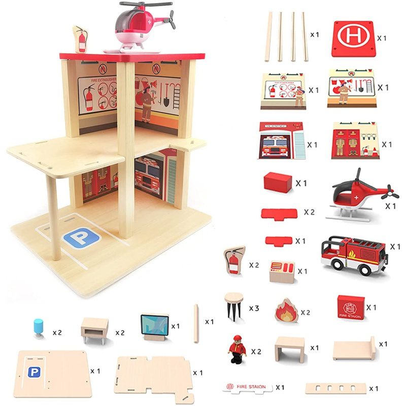 Drvena vatrogasna postaja: Vatrogasna postaja na tri razine sadrži ured, sobu za odmor, helikopter s vlastitim sletištem, vatrogasno vozilo s parkirnim mjestom, dva vatrogasca, dva aparata za gašenje požara i više dodataka. Potrebno sklapanje od strane odrasle osobe.