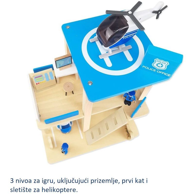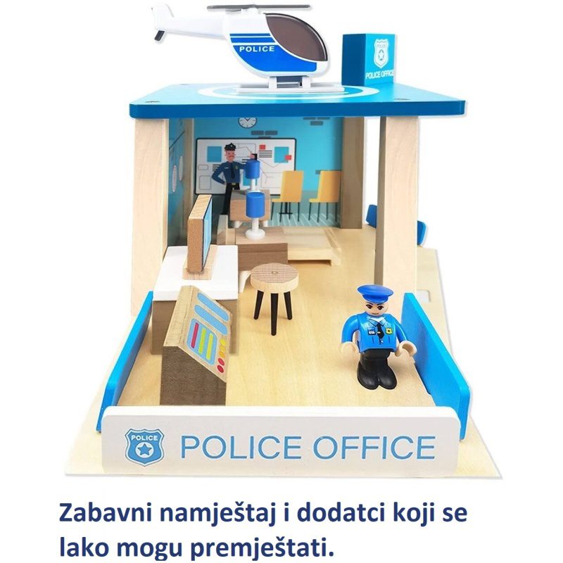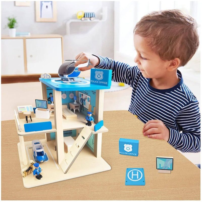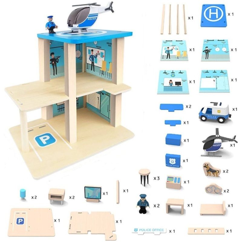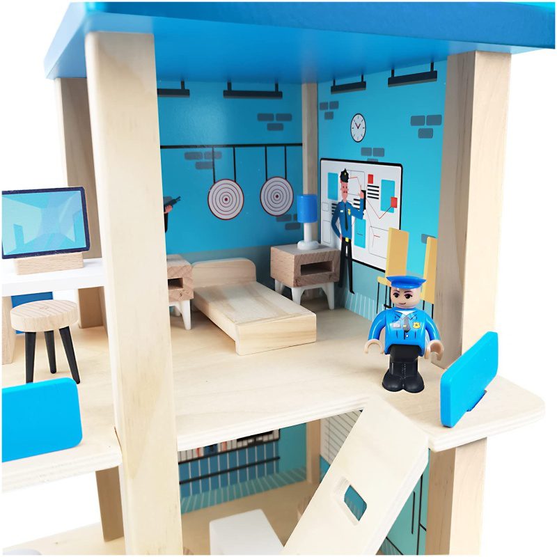 Zabavna i obrazovna igračka: bočna i prednja strane policijske postaje na tri razine otvorene su za lak pristup svim dijelovima stanice, te za postavljanje namještaja. Otvoreni dizajn drvene policijske postaje omogućuje da se više djece igra u isto vrijeme.