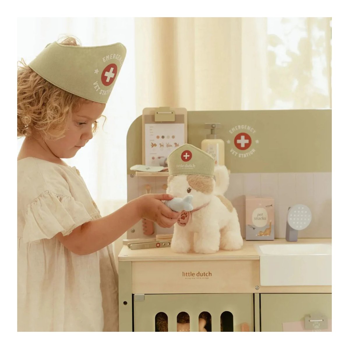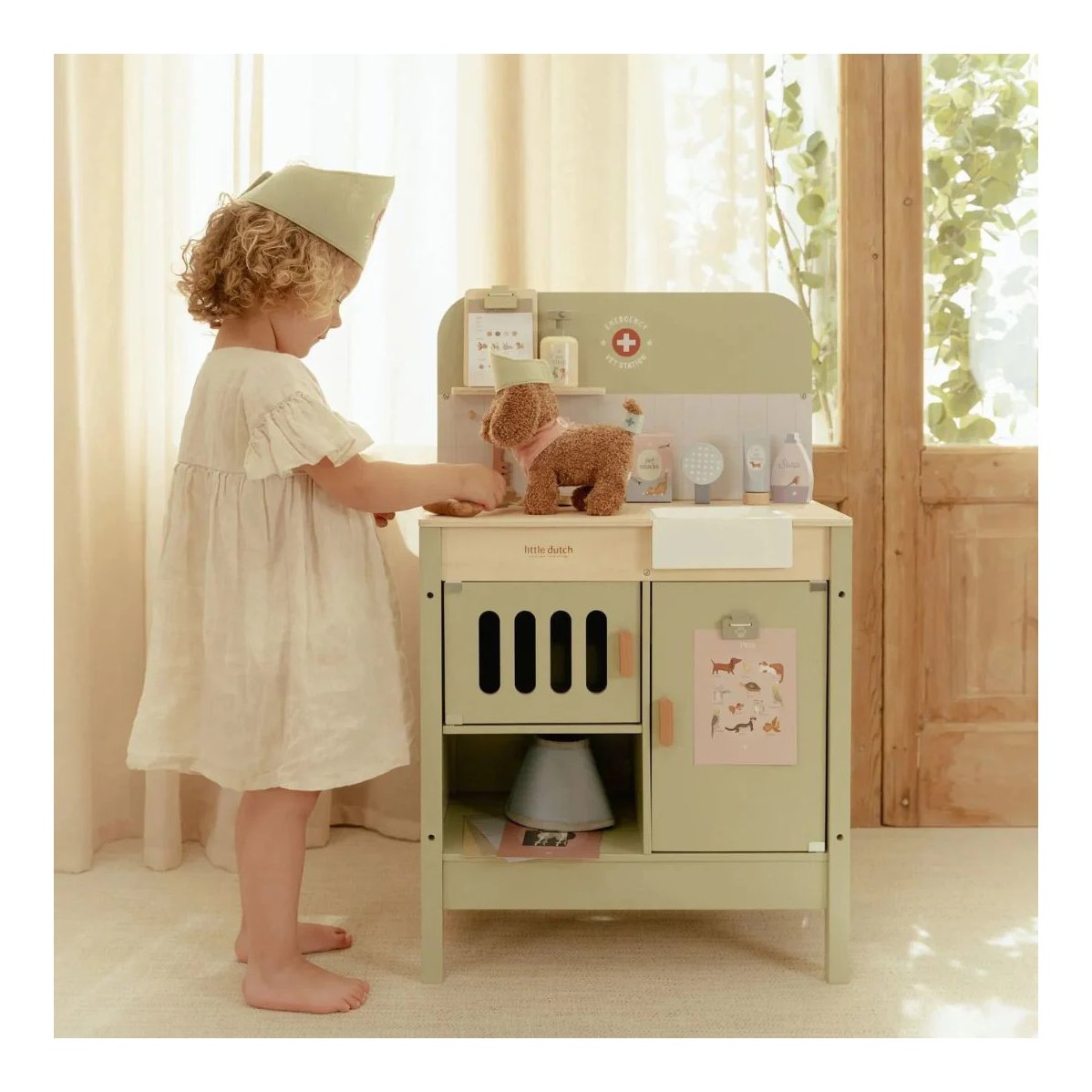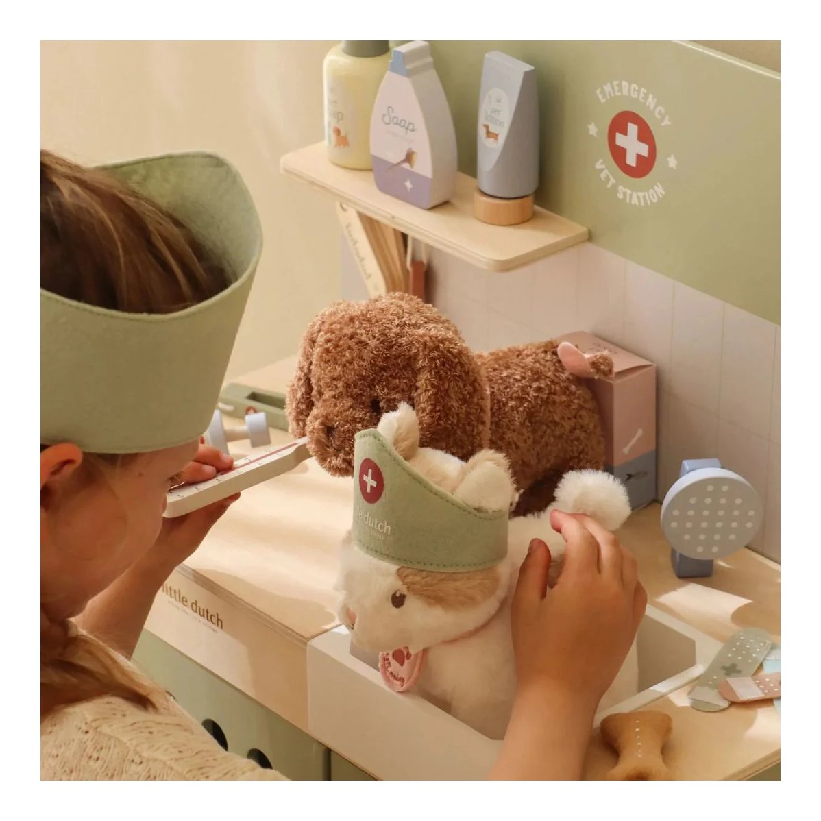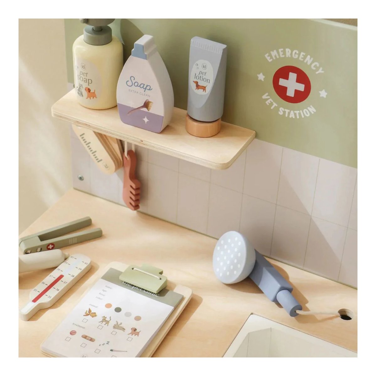 Set dolazi s realističnim dodacima poput tuša s fleksibilnom glavom, umivaonika, češlja, toplomjera, šprice i flastera. Vaše dijete će imati sve što mu je potrebno da pruža skrb svojim plišanim prijateljima. Tu je i platnena traka za glavu te posebna kopča za vješanje medicinskih ilustracija i rendgenskih snimaka, omogućujući malim liječnicima da se u potpunosti užive u svoju ulogu.