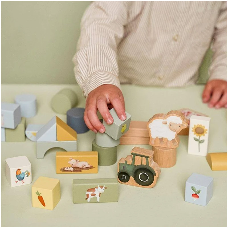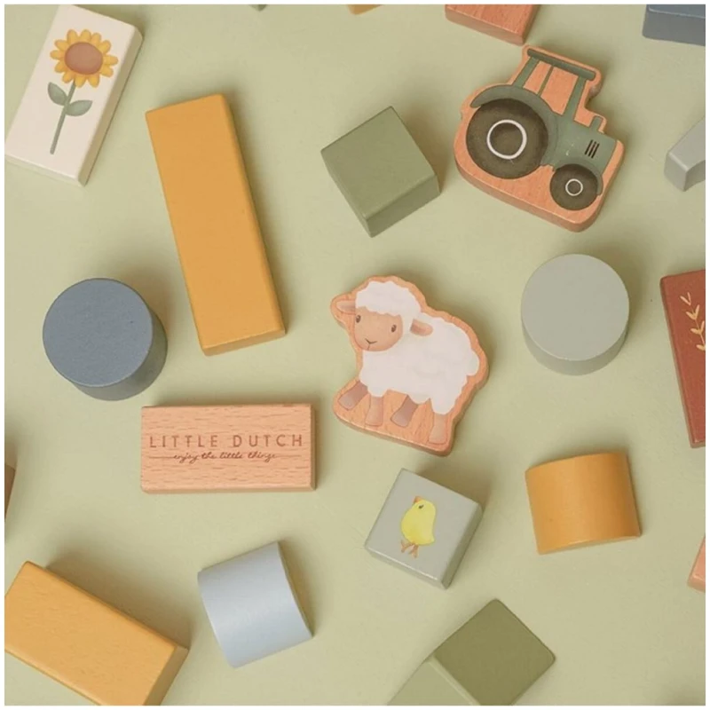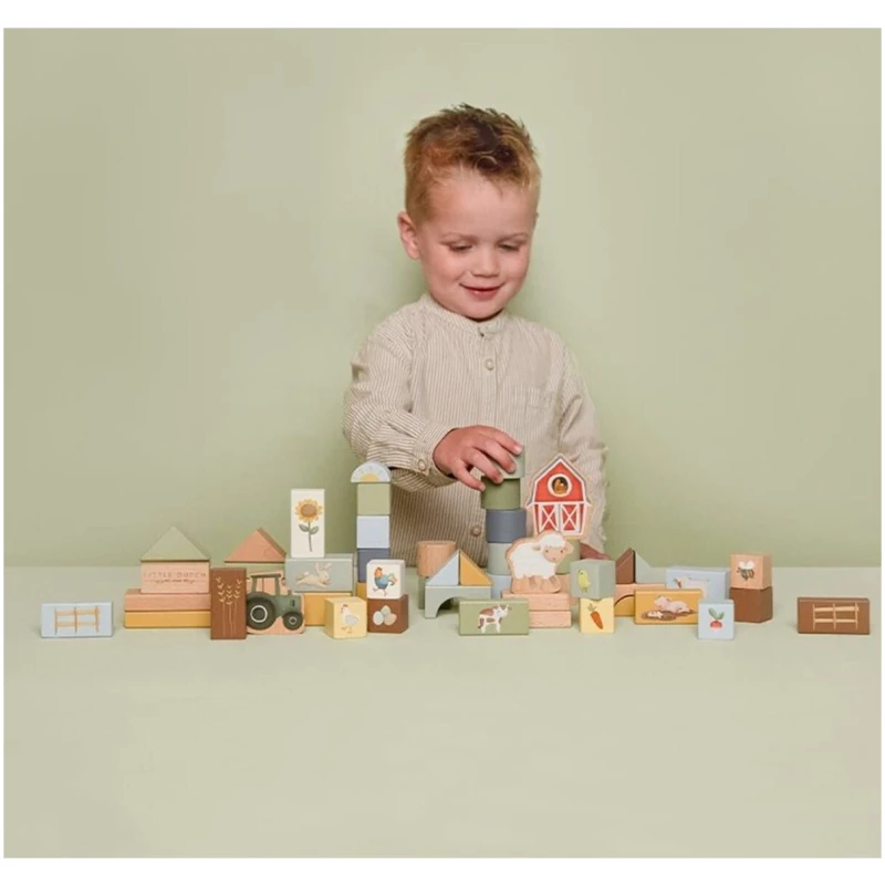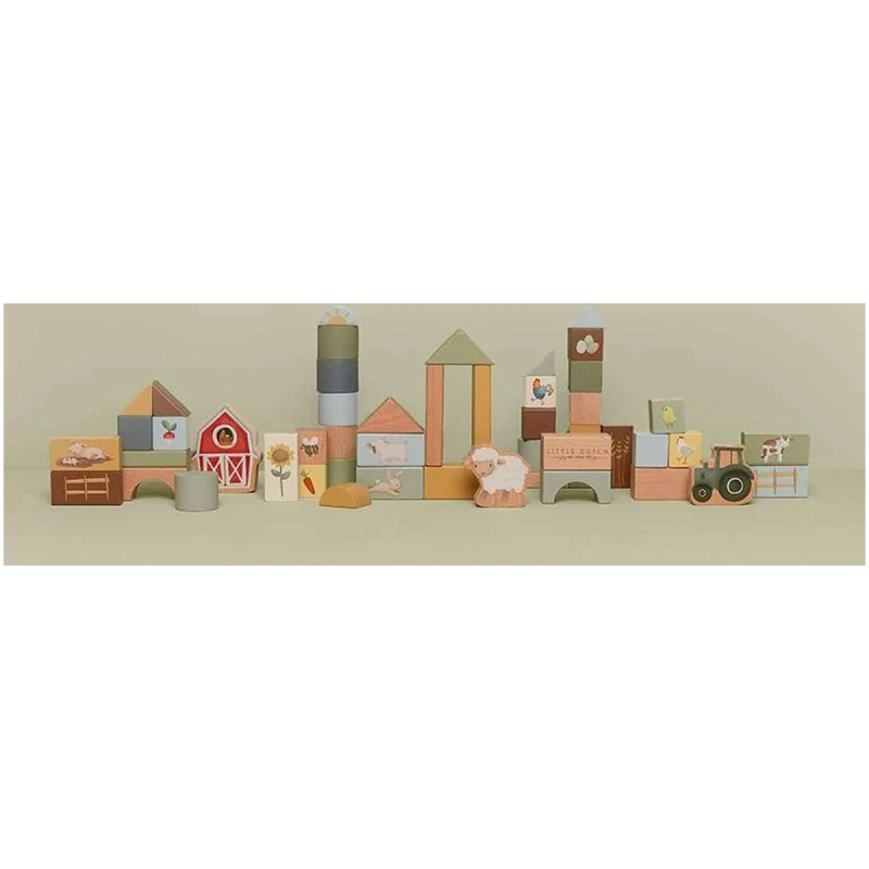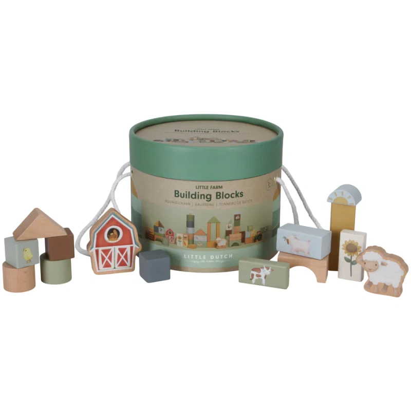 Kutija sadrži 50 drvenih kocaka u prekrasnim pastelnim nijansama s raznim otiscima iz kolekcije Little Farm. Ove kocke mogu se koristiti za izgradnju zabavnih oblika ili tornjeva. Kocke se mogu lako spremiti u kutiju i možete ih nositii svugdje. Ove kocke jamče puno zabave u gradnji i idealne su za poticanje mašte i kreativnosti.