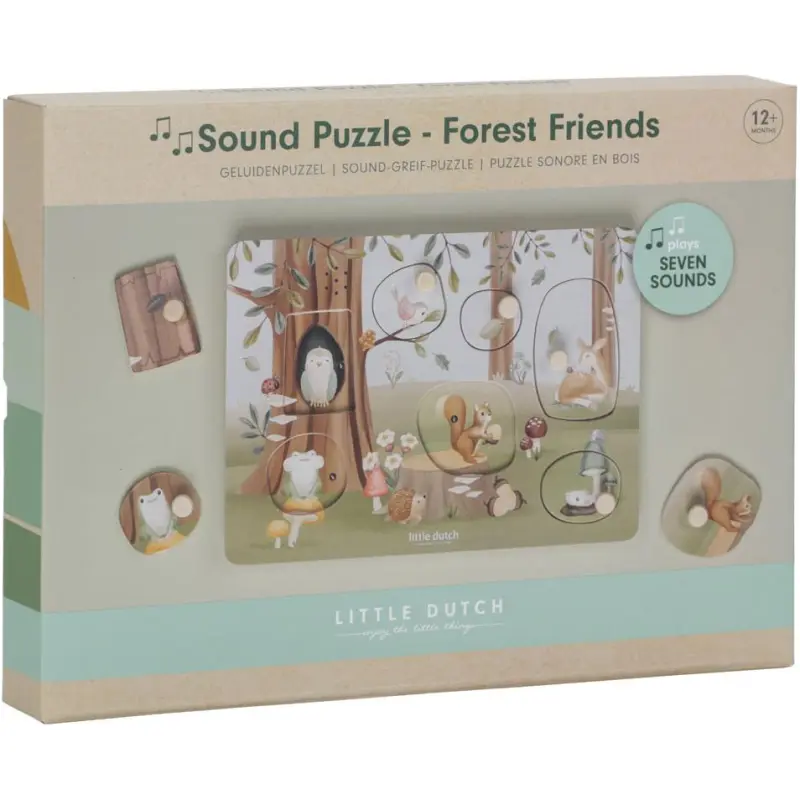 Pomozite svom djetetu u razvoju koordinacije oka i ruke uz drvenu slagalicu sa zvukom iz kolekcije Forest Friends brenda Little Dutch. Ova slagalica, sastavljena od 7 dijelova, ima motive životinja, lišća i gljiva, te potiče razvoj djetetovog rječnika i motoričkih vještina.