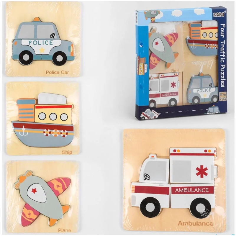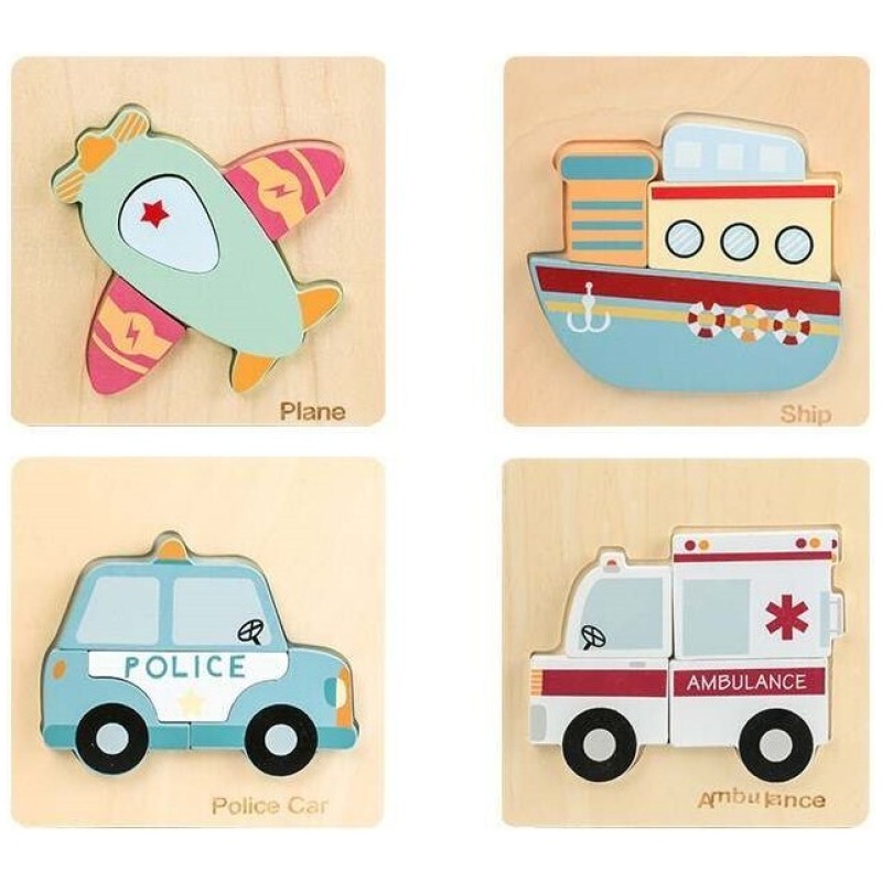 Naš set slagalica s prijevoznim sredstvima sastoji se od 4 komada sa po 5 dijelova za sastavljanje prijevoznih sredstava – policijskog auta, broda, vozila hitne pomoći i aviona, pružajući nevjerojatnu raznolikost i mogućnosti za kreativan i poučan doživljaj igre. Svaka je ručno izrađena od vrhunskog drva, pa su izuzetno kvalitetne i izdržljive. Vašem djetetu će biti zabavno satima dok slaže različite prijevozna sredstva.