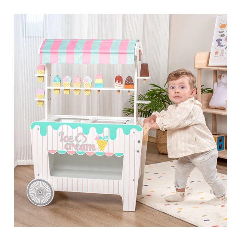 Uđite u svijet dječjih snova s Drvenim Ice Cream Marketom, gdje svaka igra postaje nezaboravna avantura za vaše dijete. Zamislite slatku radnju sladoleda koju vaše dijete može pomaknuti kamo god želi zahvaljujući praktičnoj ručki i kotačima. Ova savršeno dizajnirana igračka upravo je ono što je potrebno da bi se svako dijete osjećalo kao pravi mali trgovac sladoledom.