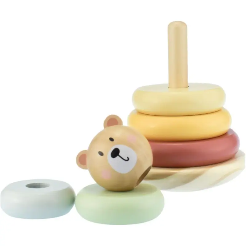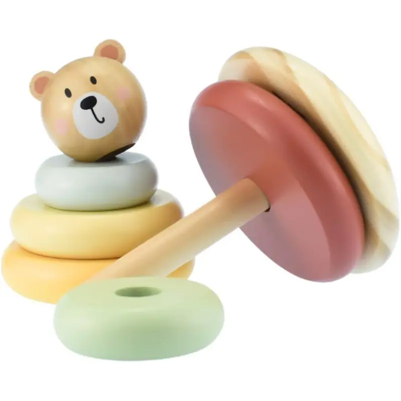 Ovaj preslatki toranj za slaganje ima pet drvenih prstenova koje djeca mogu slagati na okruglu osnovu, pružajući sate zabave dok razvijaju svoje motoričke vještine i koordinaciju oka i ruke. Kada toranj bude dovršen, završite ga medinom glavom za zadovoljavajući završetak.