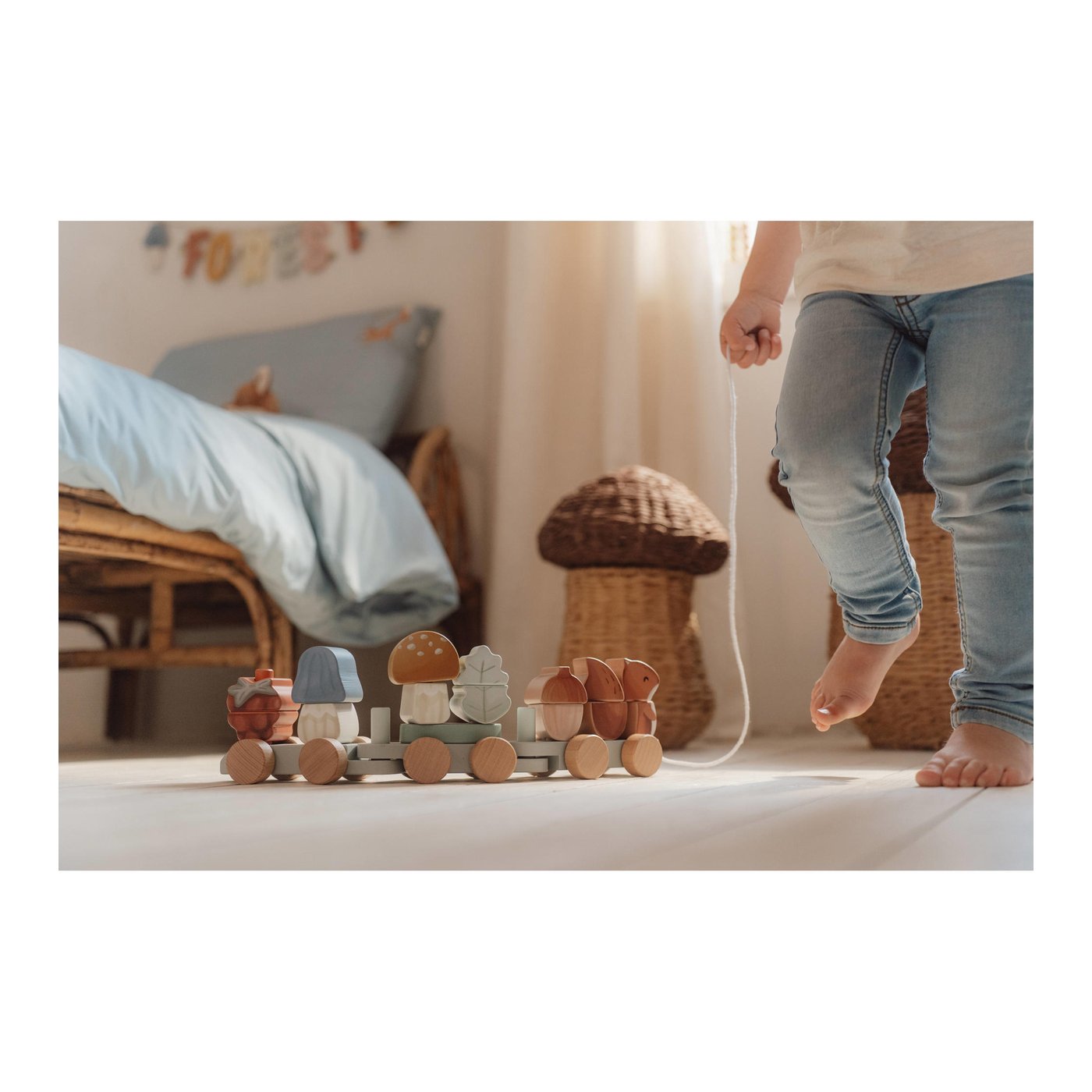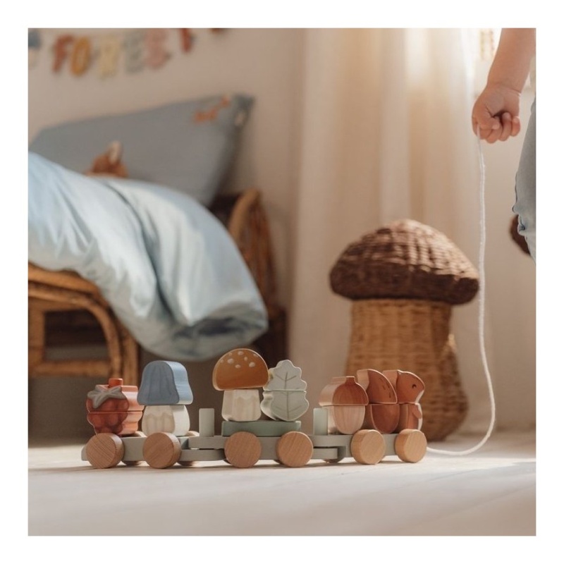 Zamislite trenutak kada vaše dijete, uzbuđeno i s osmijehom na licu, slaže blokove jednog po jednog. Svaka od 18 dijelova vlaka prilagođena je malim rukama kako bi potakla razvoj fine motorike i koordinacije ruku i očiju. Središnje mjesto zauzima razigrana vjeverica koja vodi povorku šumskih prijatelja, dok maštovite gljive i češeri čine putovanje još zanimljivijim. Vaše dijete neće samo igrati, već će se i upustiti u priču gdje će svaka igračka postati dio velikog pustolovnog putovanja kroz šumu.