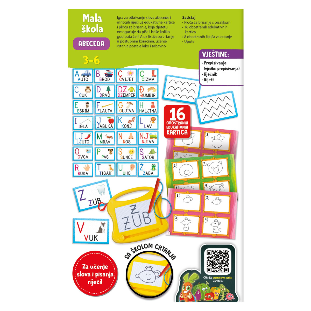 - Edukativne kartice s abecedom – Šareno ilustrirane kartice olakšavaju prepoznavanje i učenje slova kroz igru i asocijacije.