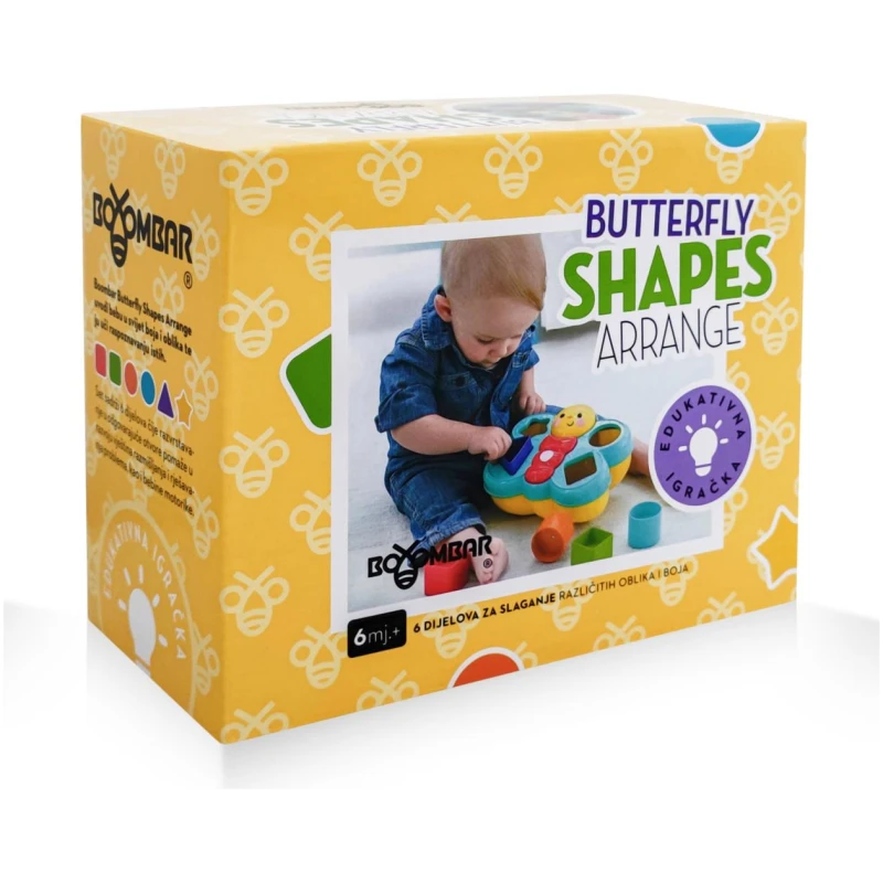 Igračka u obliku leptira sadrži kockice različitih oblika i boja koje dijete može slagati i povezivati u skladu sa svojim interesima i sposobnostima. Kroz igru, vaše dijete će naučiti prepoznavati boje i oblike, razviti finu motoriku i koordinaciju oko-ruka, te poboljšati svoju koncentraciju i pažnju.