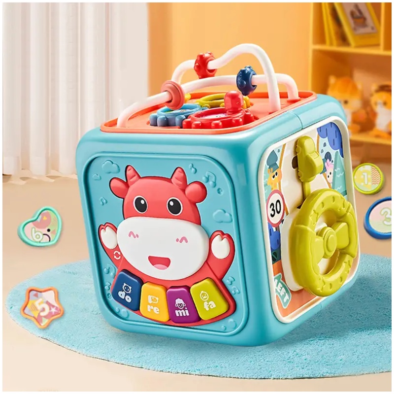 Svaka strana kocke nudi razne elemente za istraživanje i razvijanje različitih vještina kod djece. Na jednoj strani nalazi se upravljač koji se može okretati, pružajući djetetu osjećaj vozača.